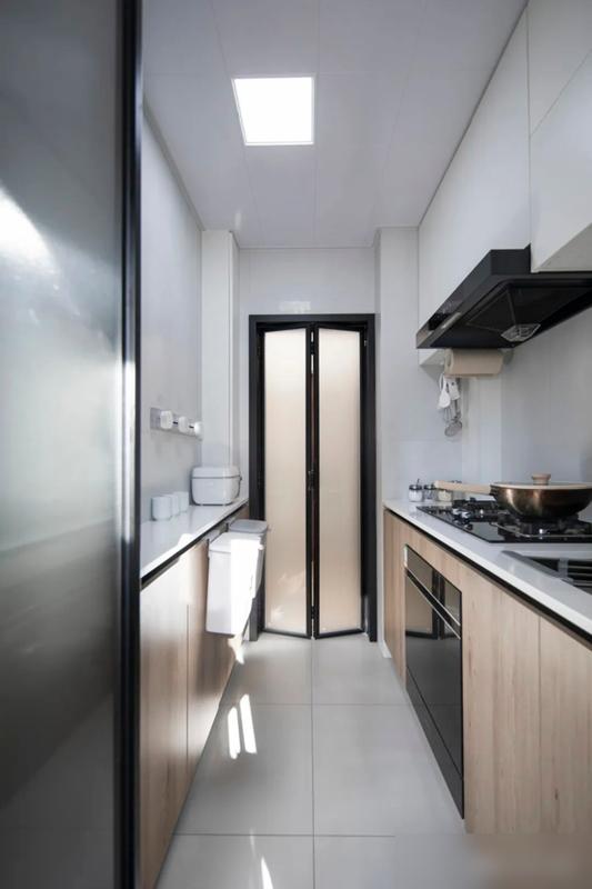 空间利用上,设计师像裁缝一样量体裁衣,折叠桌板收放自如,玻璃隔断引光入室,解决采光差的硬伤。