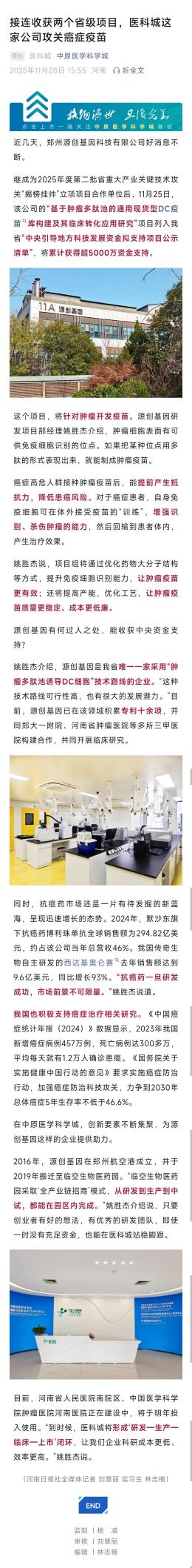 近日,中原医学科学城官方账号发布了题为《接连收获两个省级项目,医科城这家公司攻关癌症疫苗》的专题报道,对源创基因在肿瘤疫苗研发领域的重要进展与成果进行了深入报道。