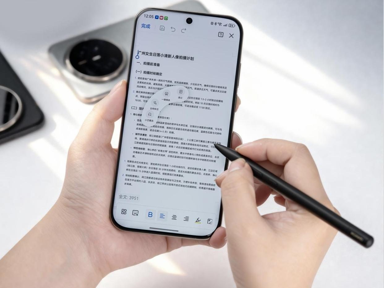 在阅读与创作场景中,华为Mate 70 Air同样拥有强大的生产力潜力。其独特的屏幕比例在竖屏状态下可多显示两列文字或三行内容,有效减少翻页频率,实现更完整、连续的信息呈现。同时,该机搭配的全新华为M-Pen 3手写笔,可以让用户轻松实现精准批注、智慧搜索与流畅演示,让灵感记录与移动办公更加高效灵活。