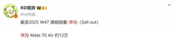 不过,日前,数码博主“RD观测”爆料的一组华为Mate 70 Air手机的销量数据却让人对Air类机型有了更高的期待。据其称,截至2025 W47(11.17-11.23)该机的销量约12万台,也就是说,自从华为于11月11日开启Mate 70 Air首销之后,仅用时13天,就取得了12万台以上销量,由此,也让该机成为了目前相当热门的Air机型。