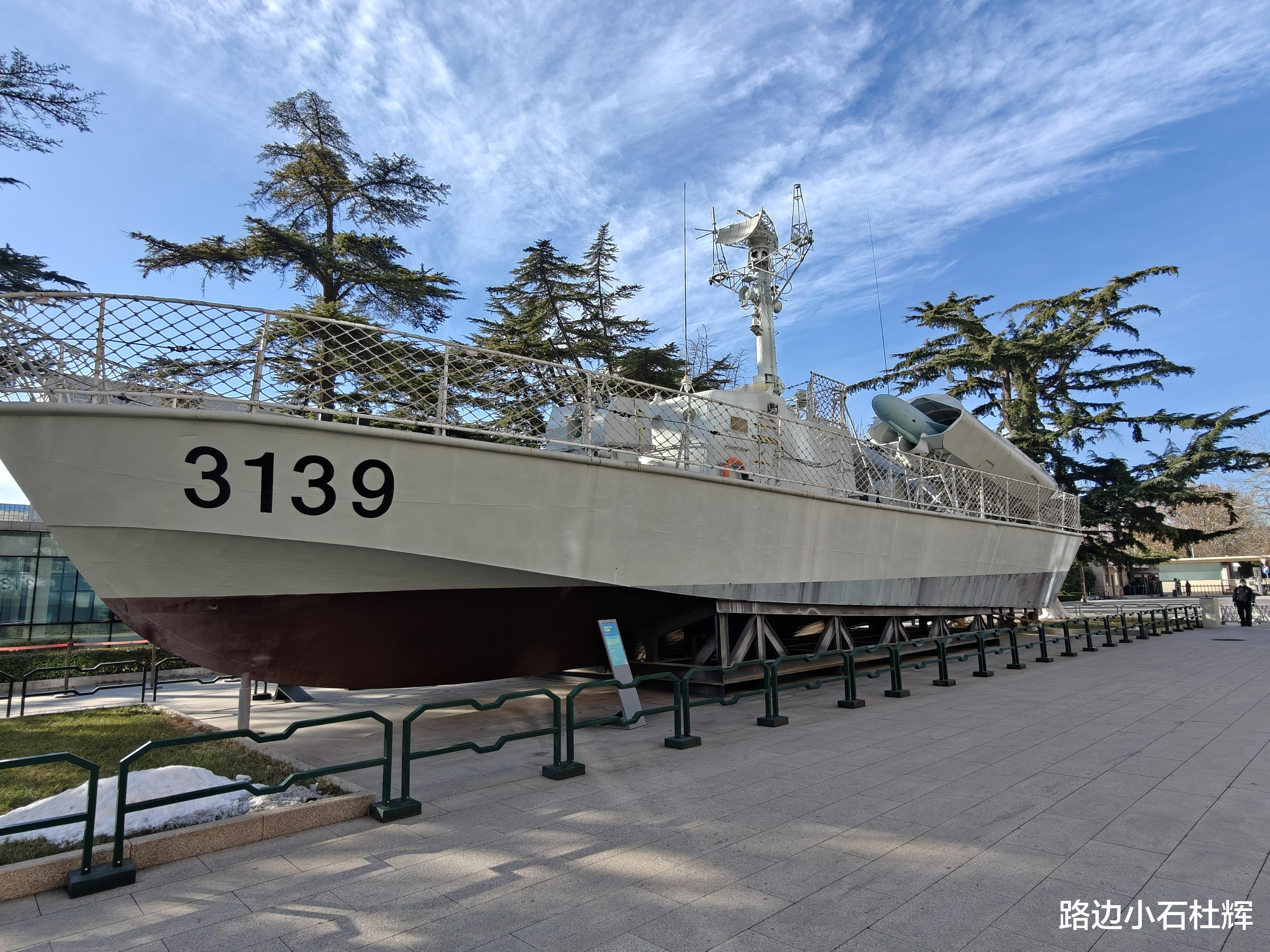 展馆室外广场上陈列着一艘导弹艇,虽然是艇,但站在下面观看,也会有强烈的空间大小对比、压迫感。当然,只能远观,不可以上艇参观。艇这个概念,一般指500吨以下的船。虽然艇在军舰里是小个子,但相比四五十吨就是重型坦克的陆地兵器,则是庞然大物了。