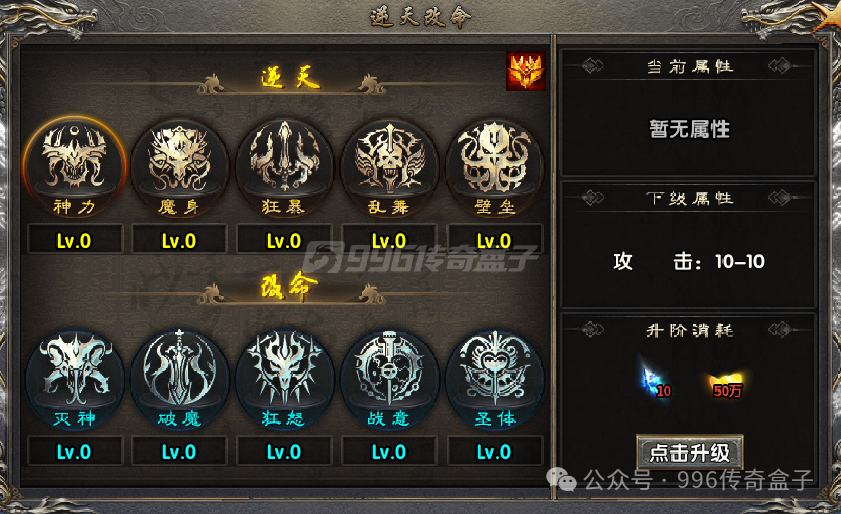 逆天改命是二大陆的新增玩法,分为逆天和改名两部分,每部分都有五个需要升级的功能。消耗材料和元宝可以升阶,获得不同的属性加成,全部升到十阶,会有显著的属性提升,打怪效率会大大提高。
