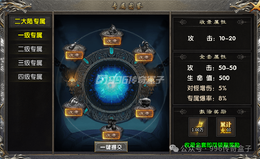二大陆开始自由探索,下图刷怪之前可以查看一下安全区左上方的专属图鉴,每个专属都会标注出处地图和怪物,下图刷怪可以有针对性的去刷。专属装备爆出优先穿戴,多余的提交图鉴,单个收录加攻击属性,全套收录除了套装属性相加,还会有灵符和累计充值奖励!