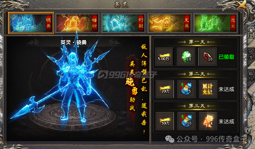 一大陆并不是简单的起步大陆,需要注意的玩法系统也非常多!首先是英灵系统,五个英灵,骁勇、锋锐、刚毅、无畏、忠义,上线在福利大厅领取主播助力后,就能获得首充礼包,里面会有激活英灵的材料。激活后就可以领取福利,五个英灵都能领取,连领三天,意味着能领十五次。第二天和第三天还能领取累计充值和充值券,用来激活冠名!英灵激活后就能培养,还会有很强的羁绊属性,这个是前期优先升级的重点!