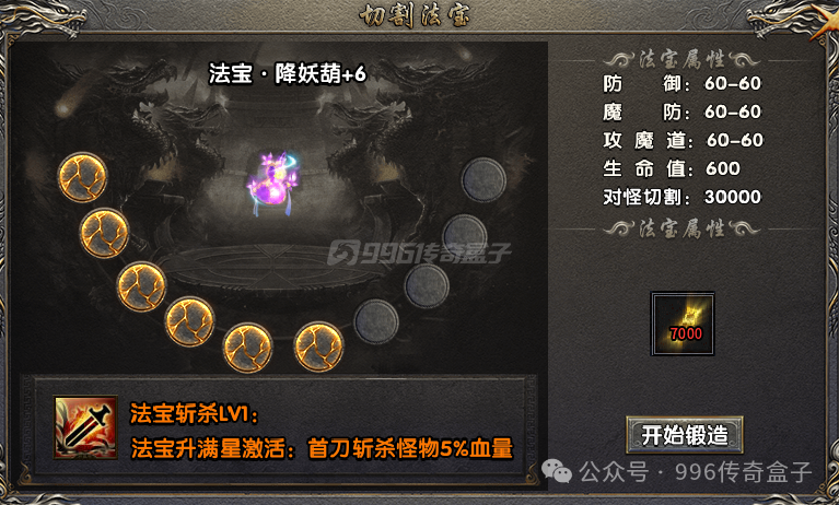 切割是快速起步的关键,锻造切割需要消耗灵符,灵符打怪、福利大厅等途径都会非常容易获得。每个大陆对应的切割法宝是不一样的,二大陆是法宝降妖葫,三大陆会升级变为恶魔之眼,大陆越高,法宝的切割属性越强。