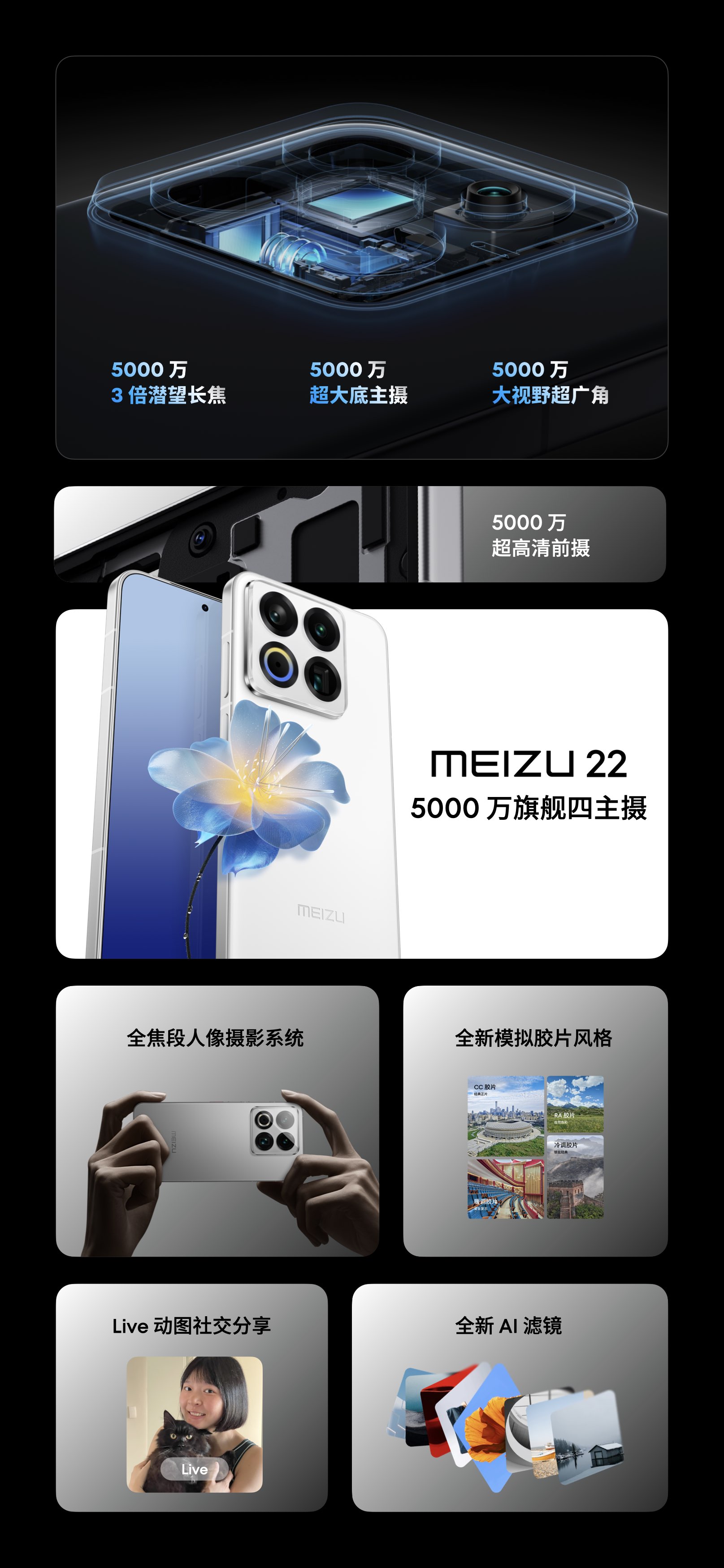 影像是魅族22这一次提升最大的地方了,也算是魅族影像之路的一个全新起点。四颗 5000 万像素级别镜头,后置搭配分别是OV50H,索尼 IMX882,OV50D。主摄为 OV50H 满血版,配备 ALD 超透镀膜与旋涂工艺,进光量较上代提升 28%。潜望长焦搭载的是索尼 IMX882 传感器,3 倍光学变焦,搭配 OIS+EIS 双防抖,最高支持100倍数码变焦。超广角采用 OV50D 传感器,F2.0 大光圈,视野覆盖 122°。而前置也是是同尺寸机型中少有的高像素5000万前摄方案。