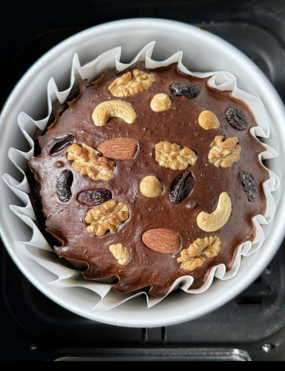 将模具放入预热至一百六十度的空气炸锅中,设定时间为二十五分钟。在烘烤的过程中,可可与香蕉的混合香气会渐渐弥漫开来,勾起人无限的食欲。由于不同型号的空气炸锅功率存在差异,最后几分钟需要多加留意,观察表面上色情况,避免烤焦。当用牙签插入布朗尼中心,拔出时牙签干净无湿面糊,就说明它已经烤好了。