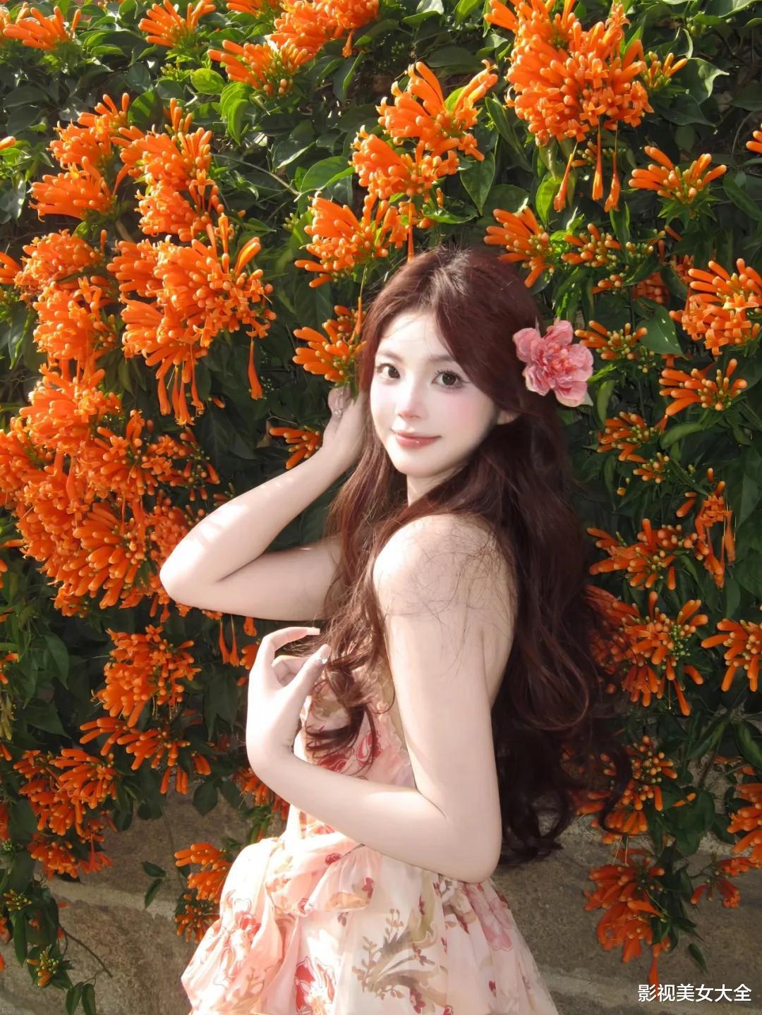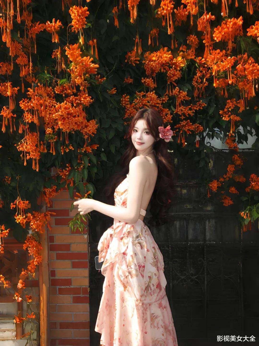 站在花墙一侧,手里轻轻拿一片花瓣,身体保持侧身,再回头对着镜头微笑,这个拍照动作很适合拍全身,人物线条会很好看,花墙作为背景也很加分,整体画面很出片。