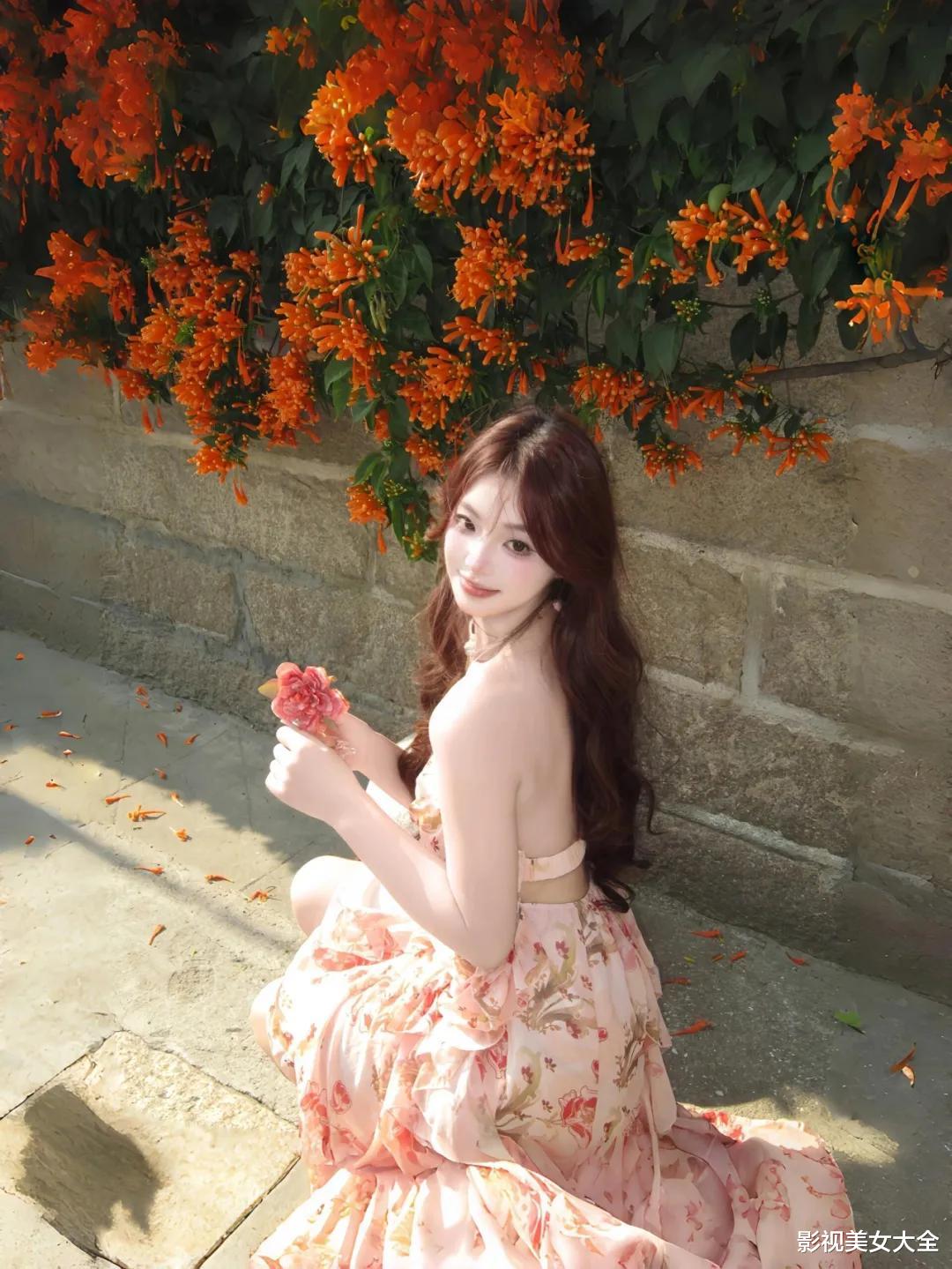 在花墙下侧着蹲下来,手里拿着一朵花或者花枝,再回头笑一下,这个拍照动作很有故事感,人和花形成呼应,画面看起来温柔又浪漫,很容易拍出好看的照片。