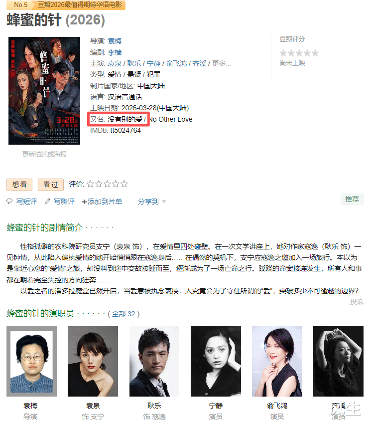 比如说过几天就点映,3月28日正式上映的《蜂蜜的针》就“意外”的复活了。