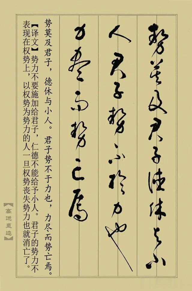 其草书笔法灵动恣肆,线条如蛟龙游走,笔势连绵却不失筋骨。提按转折间,墨色浓淡干湿的变化,既得草书“流而不滑、放而不野”的法度,又将《止学》中“智极则愚、势无常也”的思辨张力,融入笔锋的疾涩节奏里。观“大智知止,小智惟谋”一句,行笔迟速相济,墨痕的枯润对比恰如智者进退的收放;书“势莫及君子,德休与小人”时,线条的刚柔并济,暗合文中处世的方圆之道。