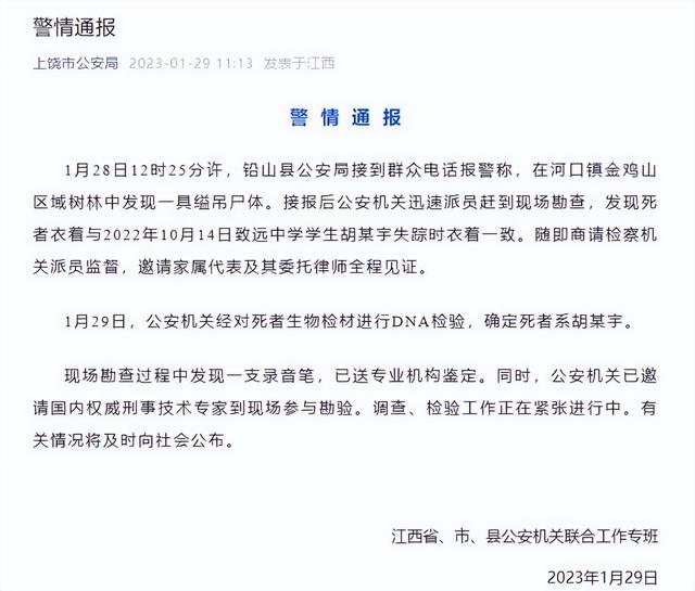 2023年1月28号,铅山县公安局接到群众举报,说在金鸡山附近的森林里,发现了一具“缢吊尸体”,他们很快就来到了案发现场,发现死者身上的衣物,与胡鑫宇失踪的时候一模一样,这让他们不得不怀疑,这个人就是胡鑫宇。