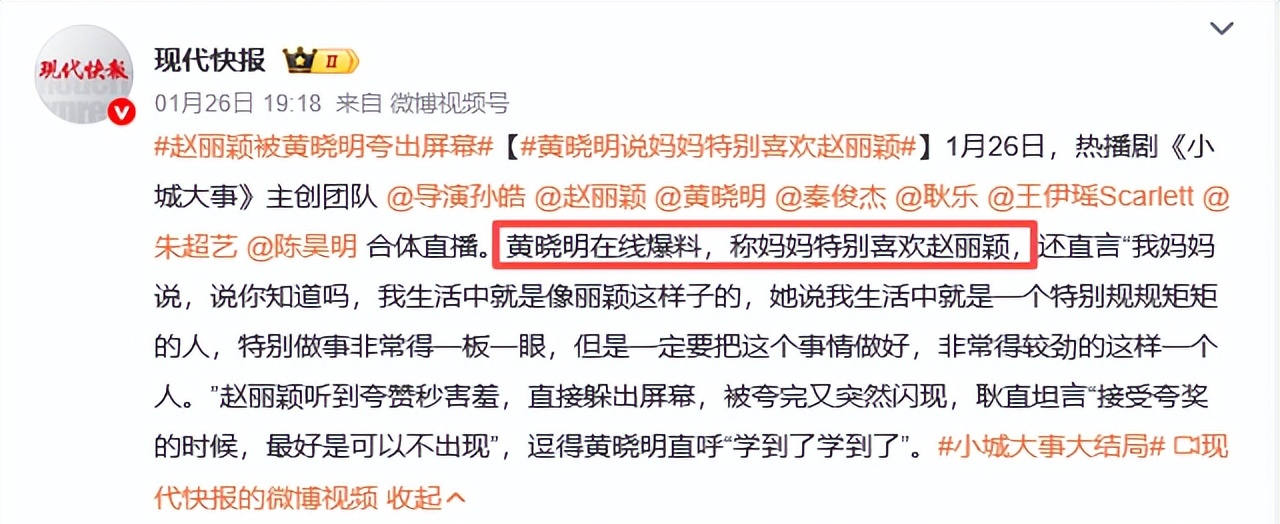 更让人意外的是,2026年黄晓明在宣传新剧《小城大事》时的一番称赞,直接让赵丽颖的口碑再次飙升。