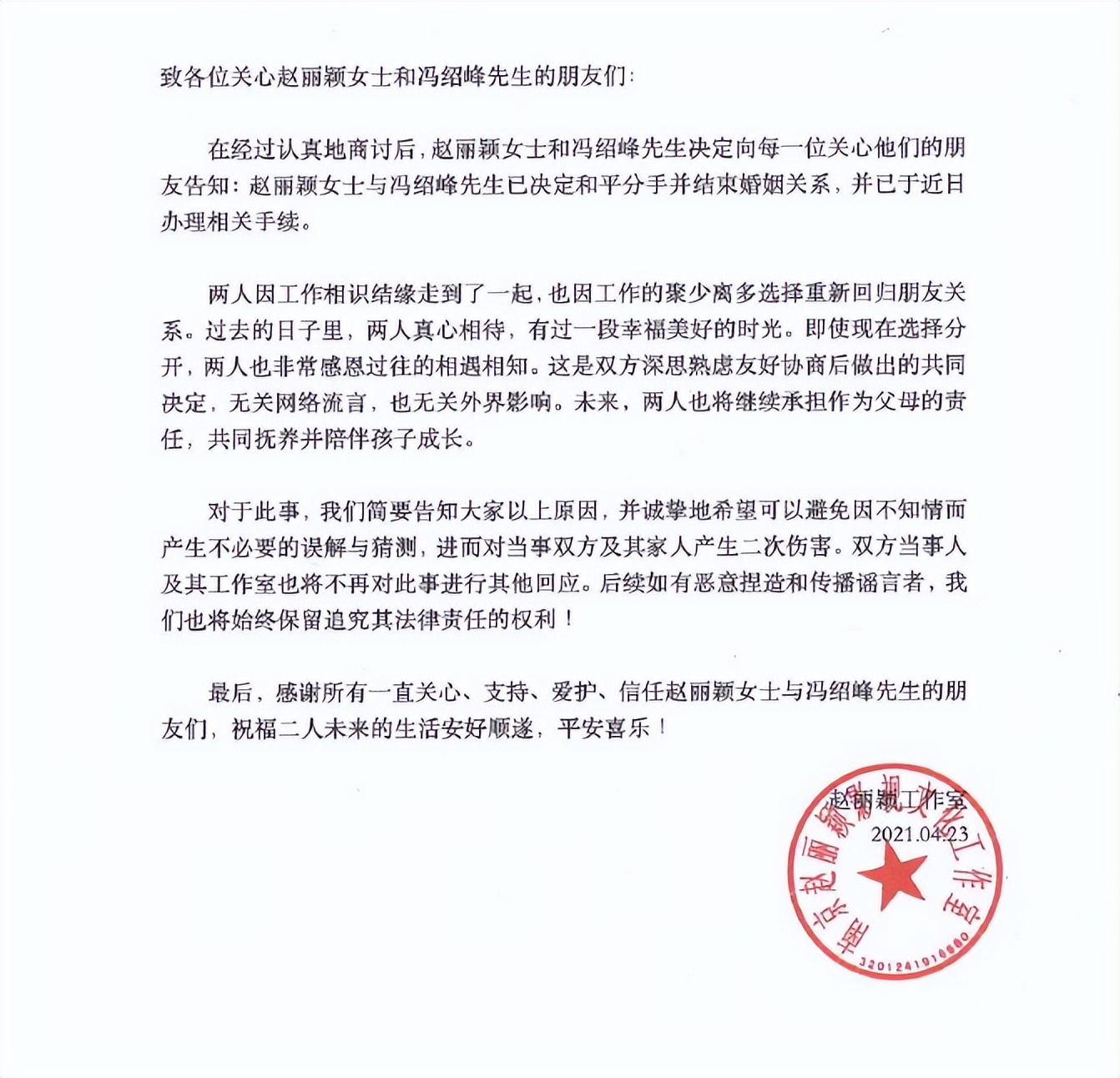 声明里强调会共同抚养孩子,好聚好散。