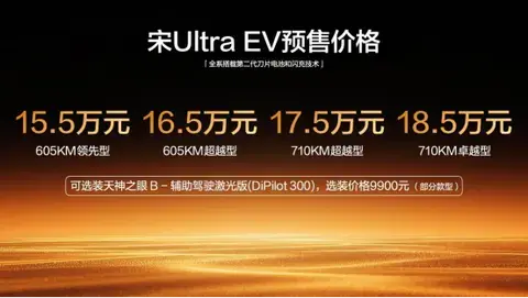 此次宋Ultra EV共推出四款配置车型,605KM领先型15.5万元、605KM超越型16.5万元、710KM超越型17.5万元、710KM卓越型18.5万元,部分款型还可选择加装天神之眼B-辅助驾驶激光版(DiPilot300),选装价仅9900元,让高阶智能驾驶体验触手可及。为回馈首批预订用户,比亚迪还推出了涵盖闪充、金融、置换、车色等多维度的重磅预售权益,且所有权益均面向2026年3月5日预售启动至上市当日24:00间,通过比亚迪APP/小程序成功下订,并在2026年6月30日前完成购车开票的用户,诚意拉满。