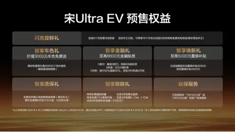 此次比亚迪推出的预售权益,也让宋Ultra EV的性价比再上一个台阶。用户可享自交车之日起18个月的比亚迪闪充充电桩免费充电权益(限非营运车主),还能额外获赠6个月闪充权益;金融方面支持最低0首付、至高5年超长贷,8万24期0息,首付50%尾款50%可享至低1年0利息0月供,至高6600元金融贴息;置换方面,比亚迪本品置换至高5000元补贴,他品置换至高4000元补贴;还能限时免费享受价值3000元的烟岚紫或棕榈绿个性外观色。质保与智联方面,非营运车辆三电系统终身保修(首任车主),整车包修期6年或15万公里,全系2年免费云服务、E-Call、i-Call,终身免费基础流量和OTA系统升级,还可选择购买原厂延保服务,全方位解决用户的用车顾虑。