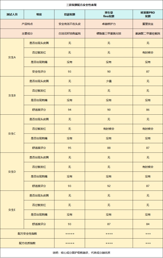 测评方法:让五名有不同头皮类型(油性、干性、混合性)的女生使用这三款发膜,使用7天后对头皮屑、过敏反应、头皮瘙痒进行跟踪检查,查看是否出现过敏、掉发、头皮屑增多等反应,并对配方安全性进行打分。