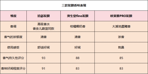 测评方法:这三款发膜每款分别使用3次,然后观察每次使用后香气的变化,记录香气的好闻程度和持续时间,并进行评分。