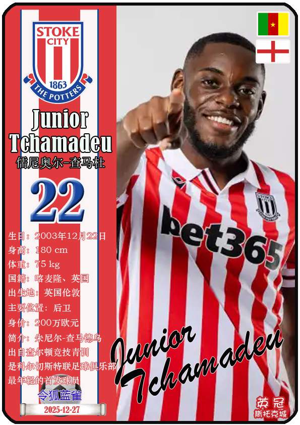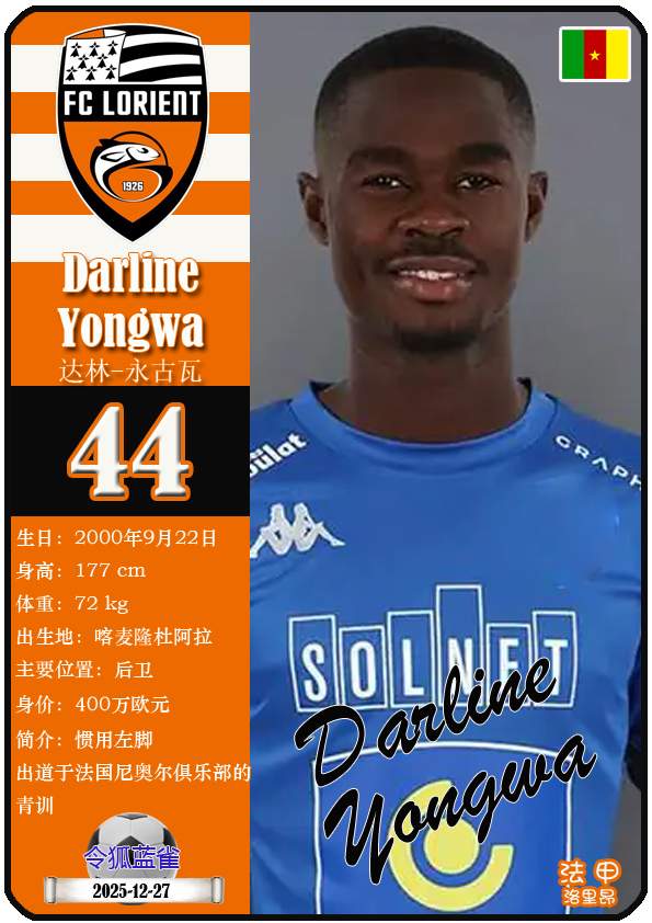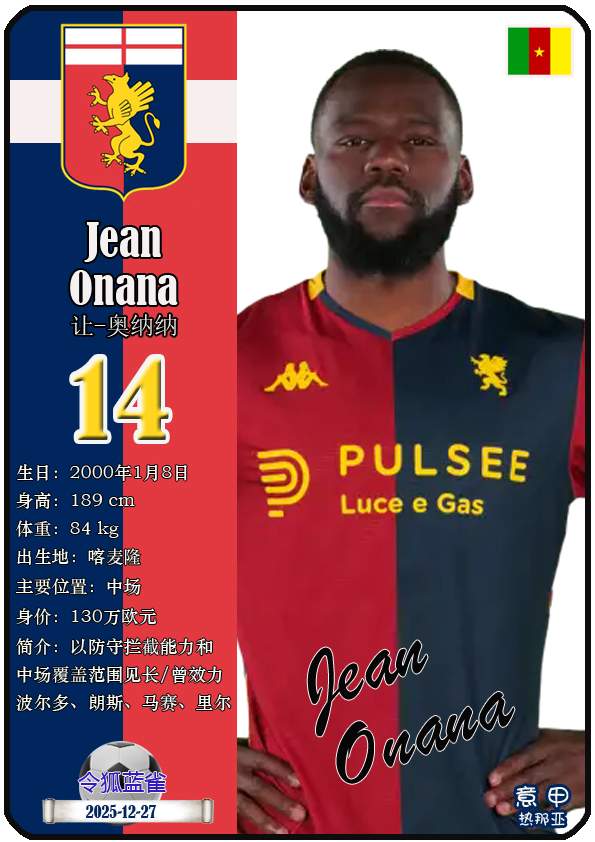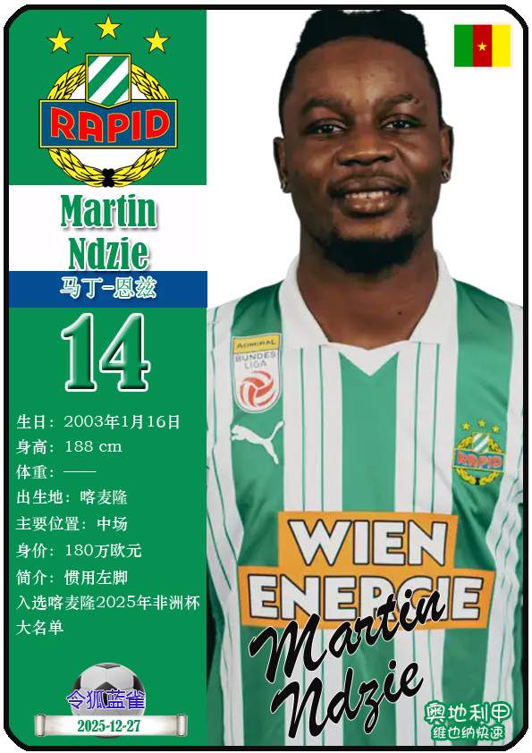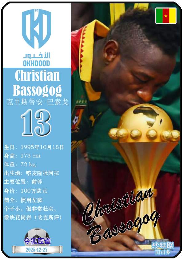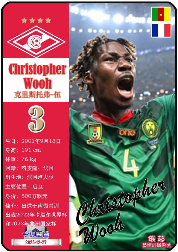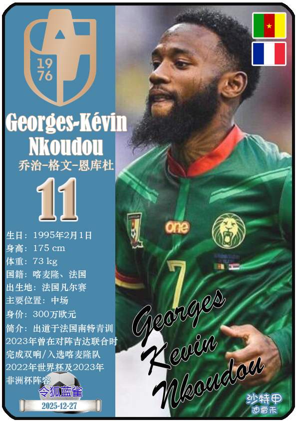 2025非洲杯于2025年12月21日至2026年1月18日在摩洛哥举办,参赛队来自24个非洲国家。喀麦隆队位于F组,目前FIFA世界排名第57(中国男足世界排名第93)。同组还有科特迪瓦、加蓬、莫桑比克队。本期盘点2025非洲杯喀麦隆队22人(按球员所属俱乐部分类排序):