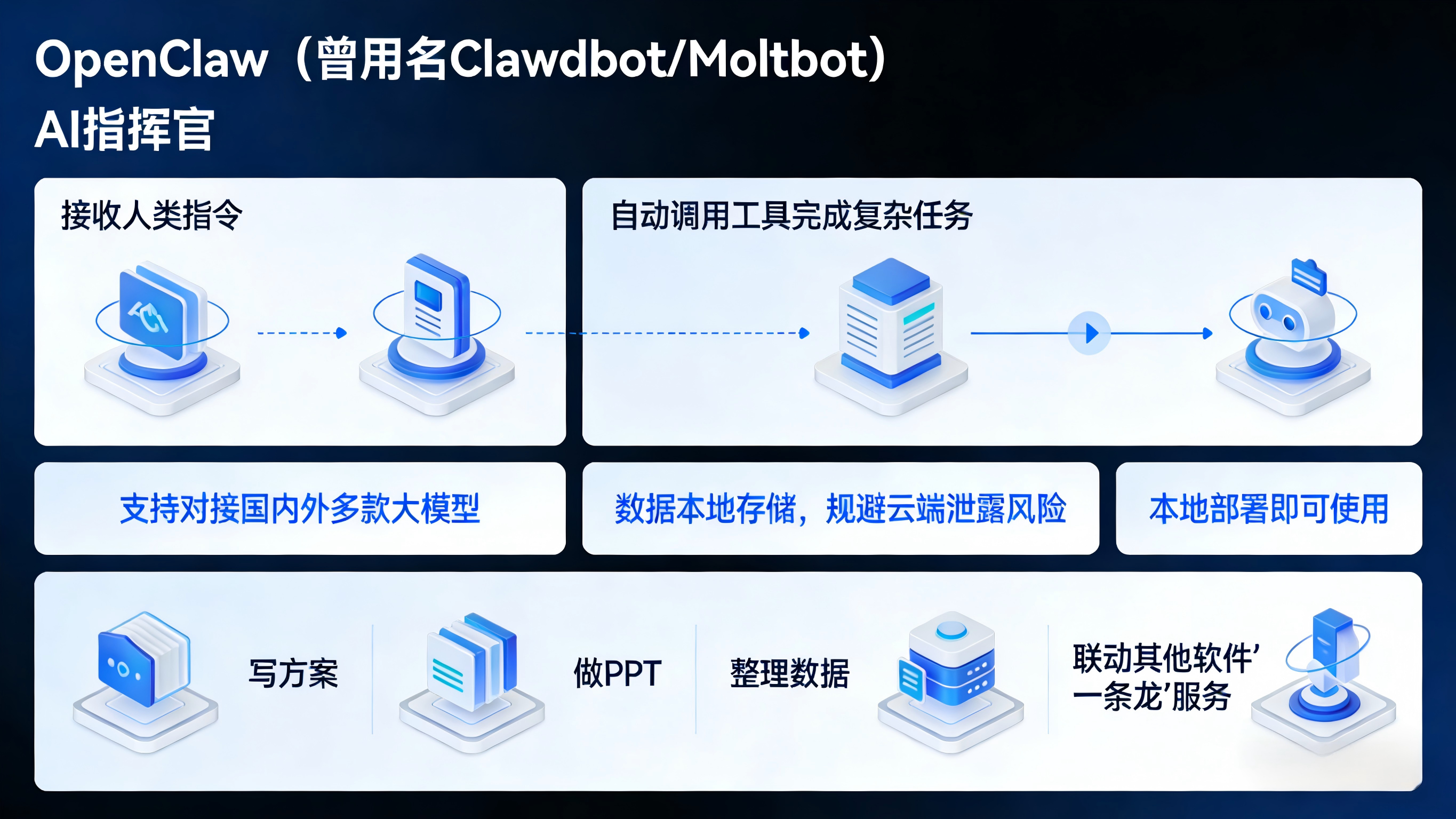 OpenClaw(曾用名Clawdbot/Moltbot)定位为“AI指挥官”,核心功能是接收人类指令后,自动调用工具完成复杂任务。