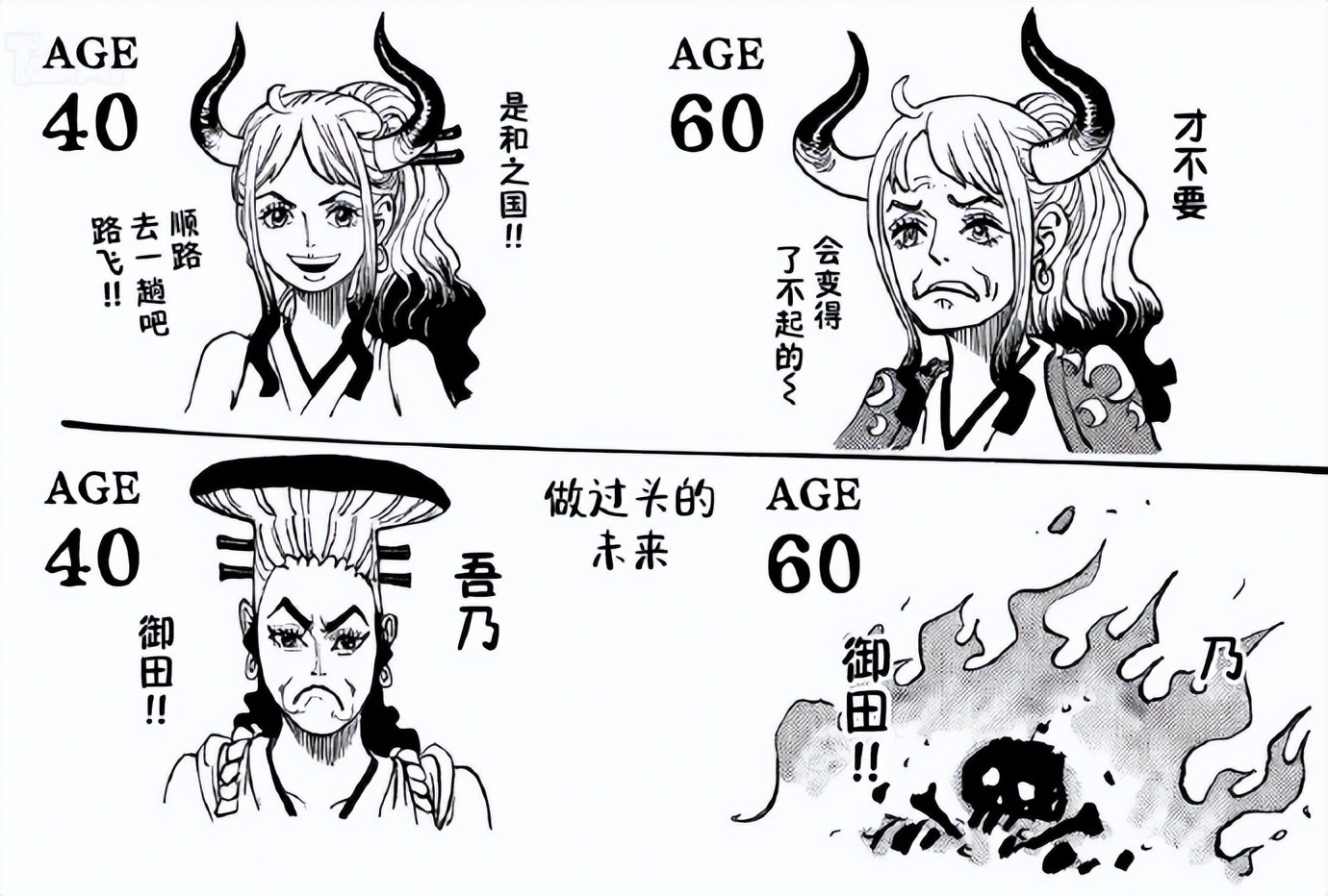 最后就是大和了,正常的大和还算是可以,但是不正常的,40岁直接变成了光月御田,60岁直接没了,尾田太可恶了,还我大和啊!