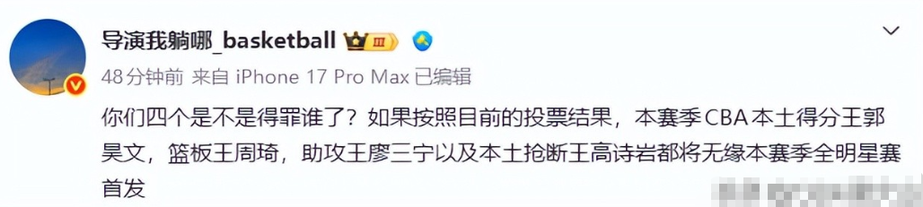 结果一出来,导演我躺哪立刻发表了看法。他对本赛季的本土得分王郭昊文、篮板王周琦、助攻王廖三宁和抢断王高诗岩没能入选全明星首发表示意外。