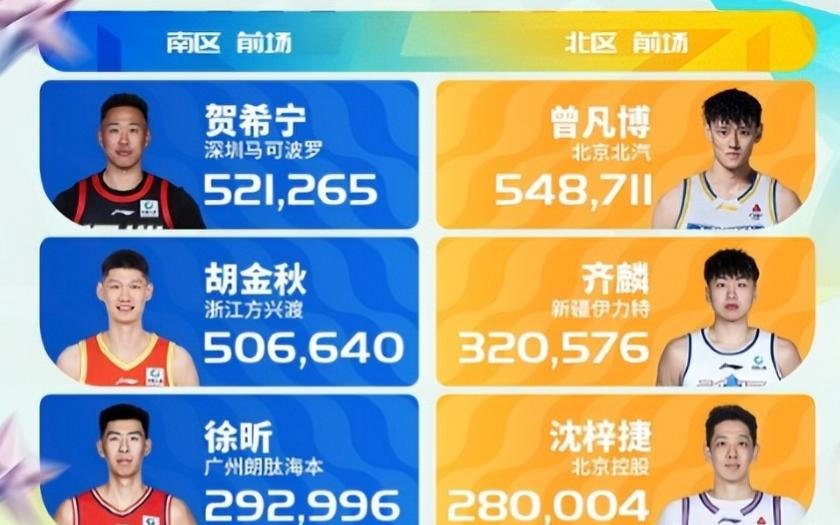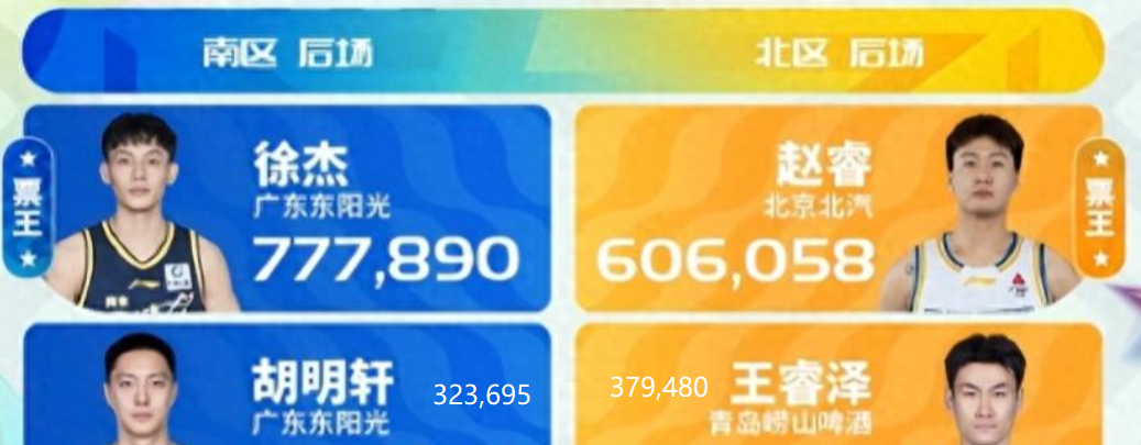 南区票王,也是全明星票王是广东男篮后卫徐杰,他目前票数是777890。排在徐杰之后的是深圳男篮后卫贺希宁,他近期状态颇佳。而深圳队在近期也战绩不俗,接连击败强队。贺希宁目前票数是521265。