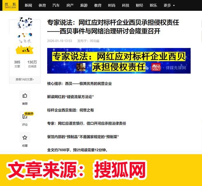 专家指出:西贝事件是网络法治的重大案例,是标志性的网红侵权事件,政府应予高度重视,应加大在保护民营企业、清朗网络营商环境、打击扰乱市场秩序方面的执法力度;必须对那些具有较大影响力、享受网络红利的网红赋予相应的法律责任,明确网络讨论规则,落实平台主体责任,从而约束网红言行、杜绝此类事件的再度发生。