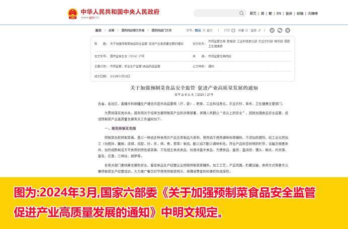 国家对于预制菜有权威定义:2024年3月,国家六部委《关于加强预制菜食品安全监管 促进产业高质量发展的通知》中明文规定:预制菜也称预制菜肴,是以一种或多种食用农产品及其制品为原料,使用或不使用调味料等辅料,不添加防腐剂,经工业化预加工(如搅拌、腌制、滚揉、成型、炒、炸、烤、煮、蒸等)制成,配以或不配以调味料包,符合产品标签标明的贮存、运输及销售条件,加热或熟制后方可食用的预包装菜肴。