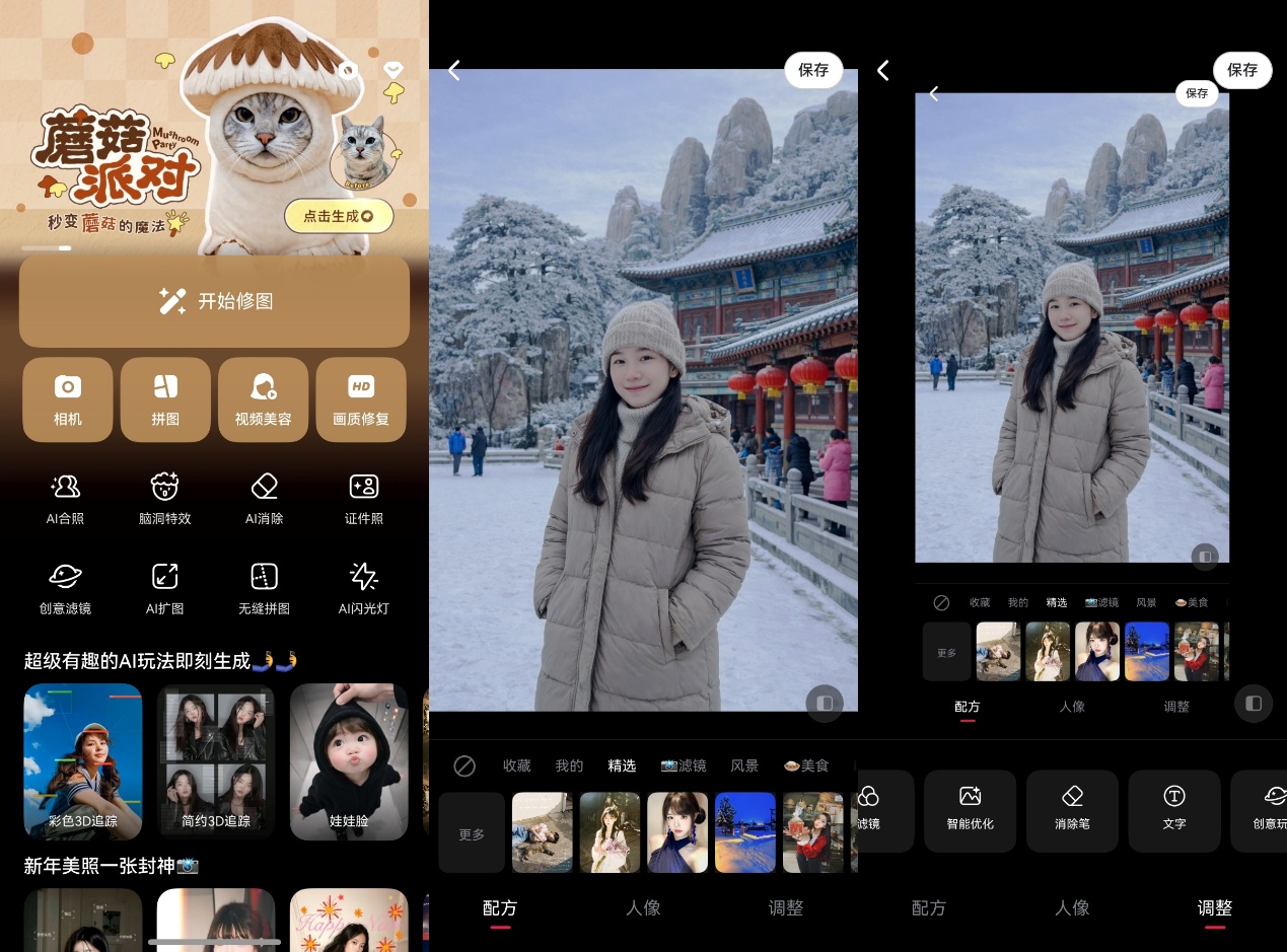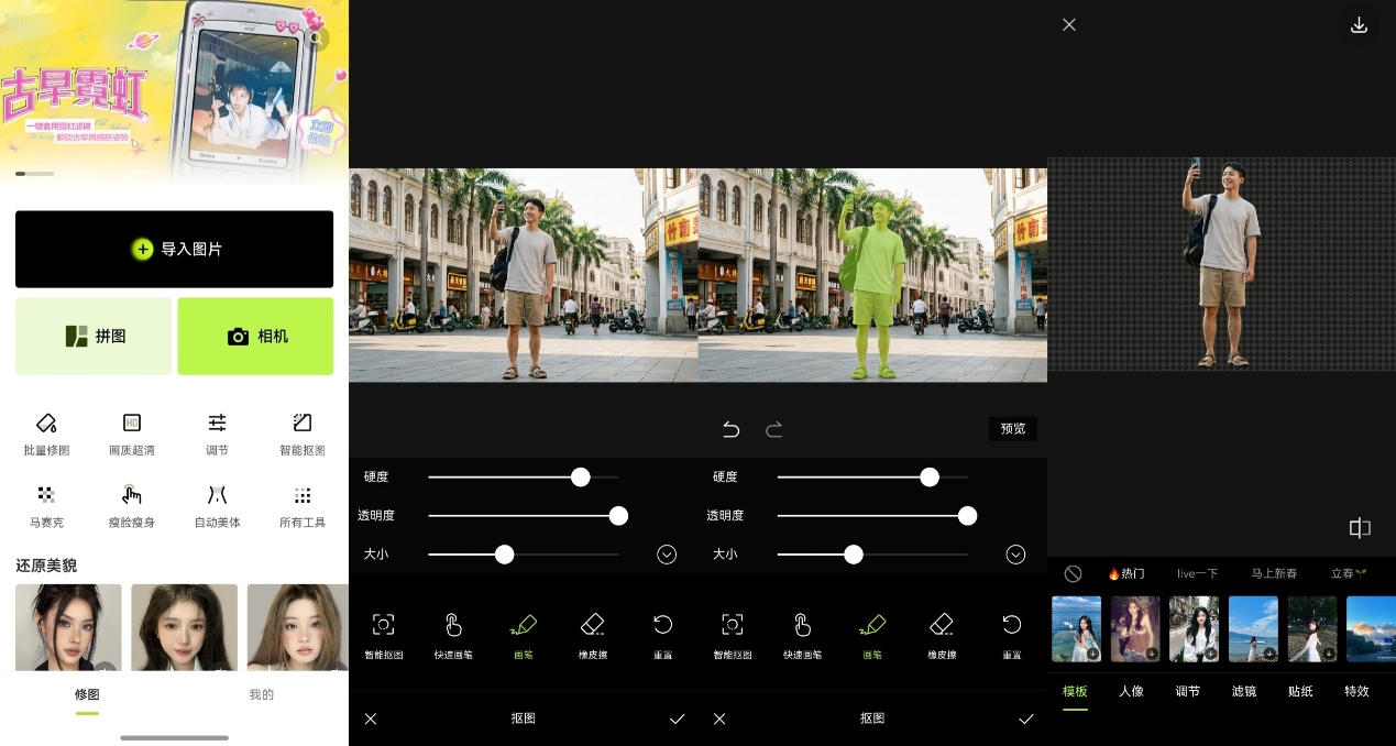 “海报、模板、拼接、自由”四大拼图模式、“AI消除”、“AI合照”……不错不错,这些功能全都回来了~首页活动还会跟随节日热点实现“周级”更新,而且不知道是用了什么黑科技,美图秀秀现在的修图加载速度那是肉眼可见的快!