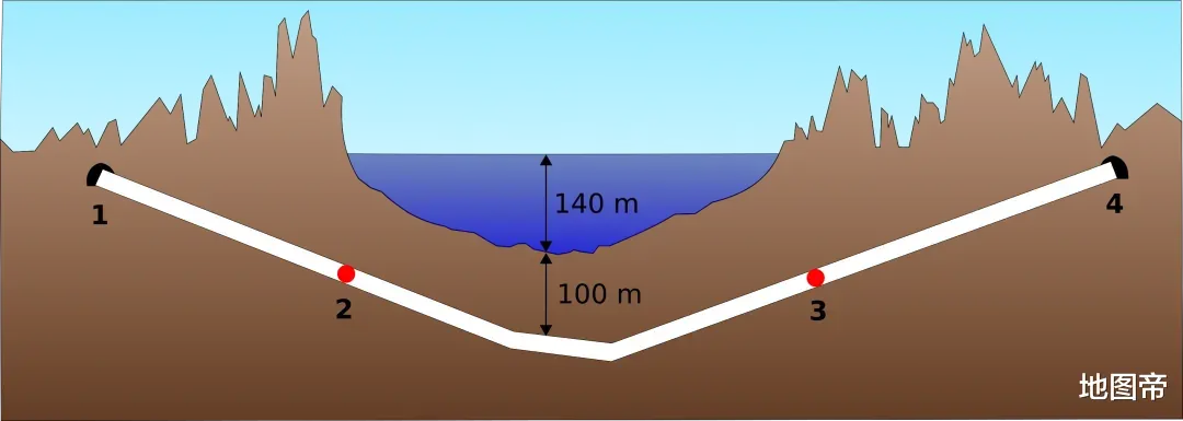 青函隧道双线设计,长53.85千米,海底部分长23.30公里,海底段最大水深140米,隧道距海底100米。