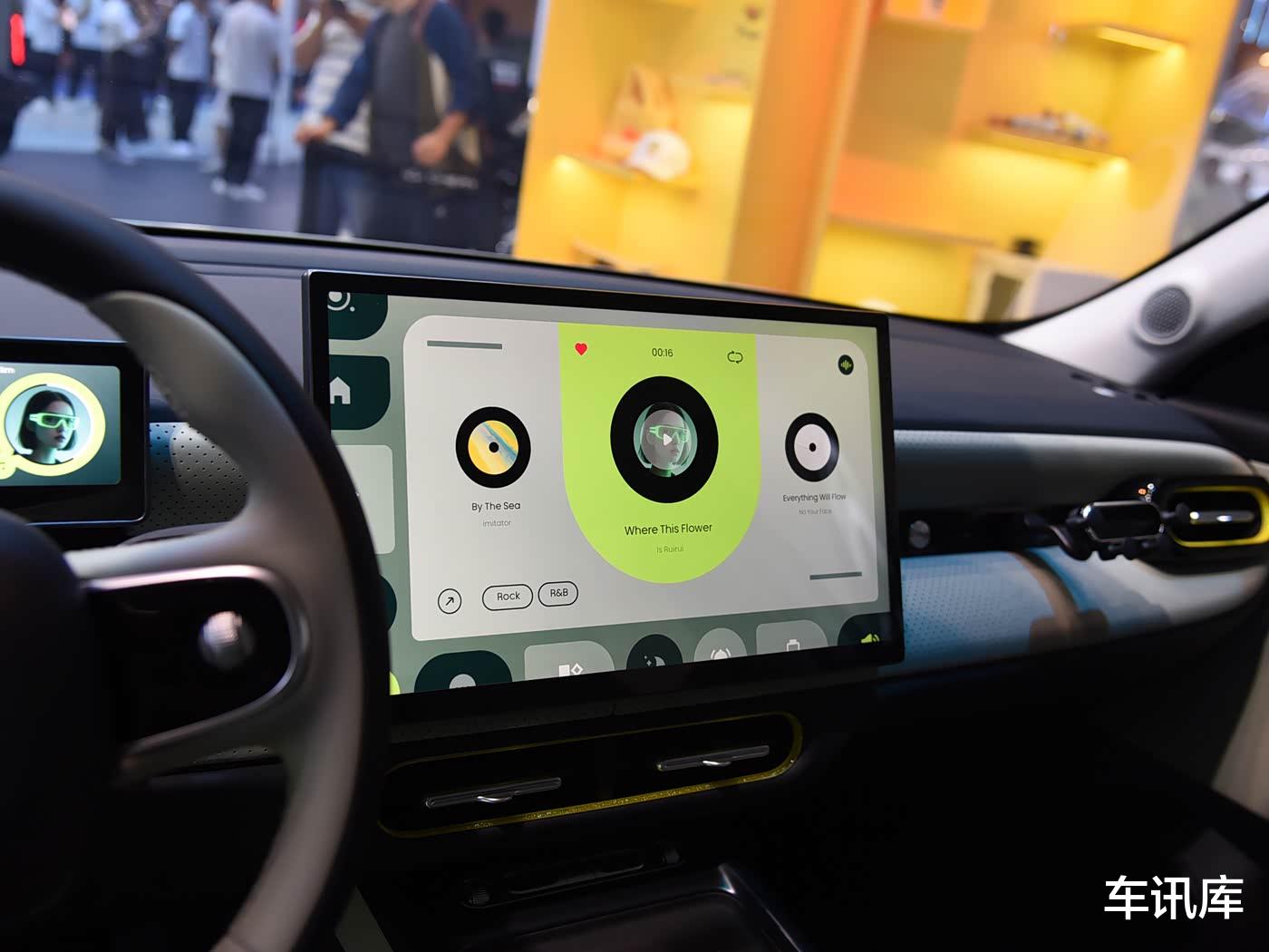 内饰采用了米白色、黑色的双色设计,并且还有不少荧绿色的镀铬点缀,不仅视觉效果很不错,看起来也是充满年轻活力。整个中控台也设计的很简洁,搭载了一块15.6英寸的超大中控屏,除了少部分的几个实体功能按键,大部分的功能也都集中到屏幕里,再加上悬浮式的液晶仪表盘,整体的科技感还是非常足。双幅式方向盘的造型也比较精致,采用怀挡式设计,而这也使得前排中央扶手台的可用区域比较大,拥有多个储物空间。