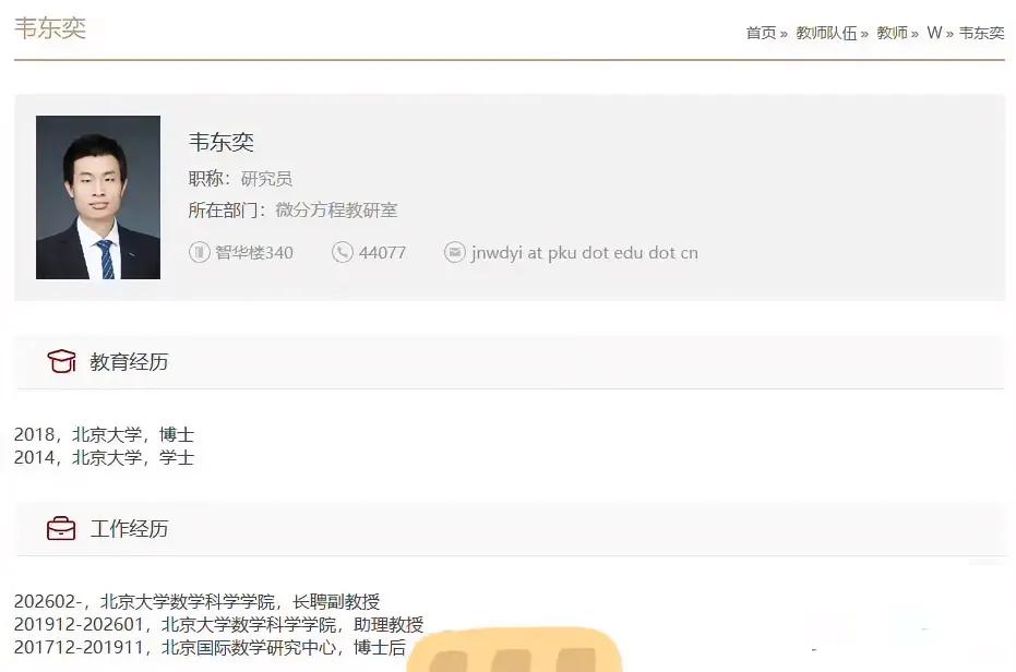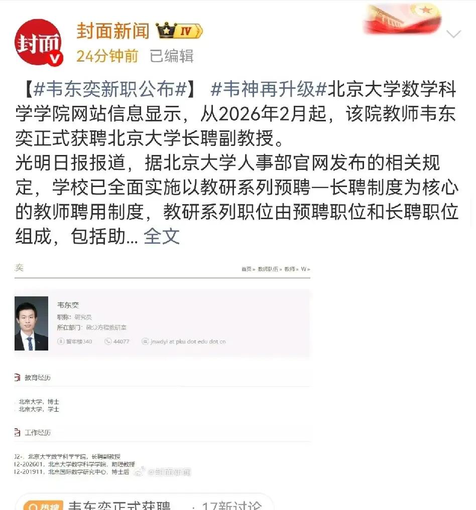 2月1日北大数学科学学院官宣,韦东奕正式升任长聘副教授,
