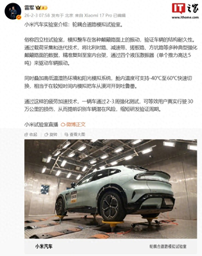 2 月 3 日消息,小米创办人、董事长兼 CEO 雷军今日发文详细介绍了小米汽车实验室中的轮耦合道路模拟试验室,其可以模拟整车在各种颠簸路面上的振动,验证车辆的结构耐久性。