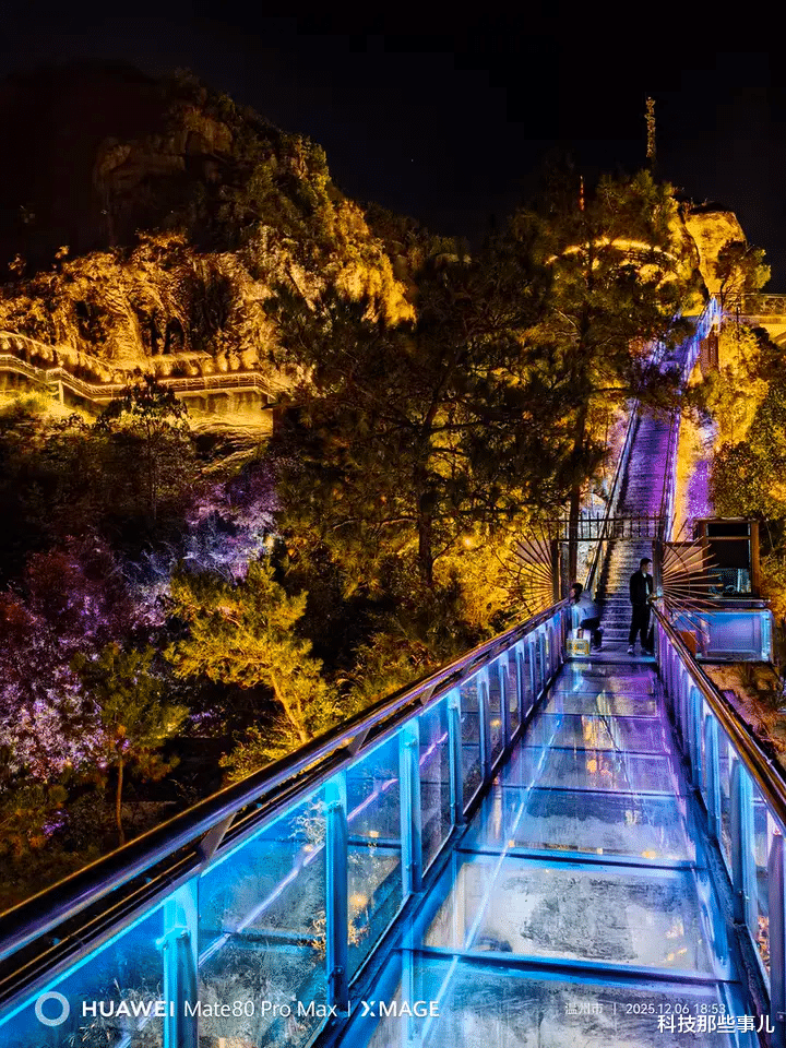 众所周知,拍摄夜景时,传统手机常常陷入“暗部死黑、亮部过曝”的困境,但当我用华为Mate 80 Pro Max拍摄公园里的发光玻璃桥时,真切体会到了“所见即所得”的震撼。红枫原色影像精准控制了蓝光溢出,让玻璃桥面的细纹甚至灰尘都清晰可辨,透过侧边玻璃还能看到后方树枝的纹理细节。另外,桥边的树木也未受环境光干扰,从主干到细枝都层次分明。尤为难得的是,它在黄色射灯下并未过曝丢失细节,灯光未及之处依然保留了丰富的暗部信息,几乎完整还原了我肉眼所见的场景。
