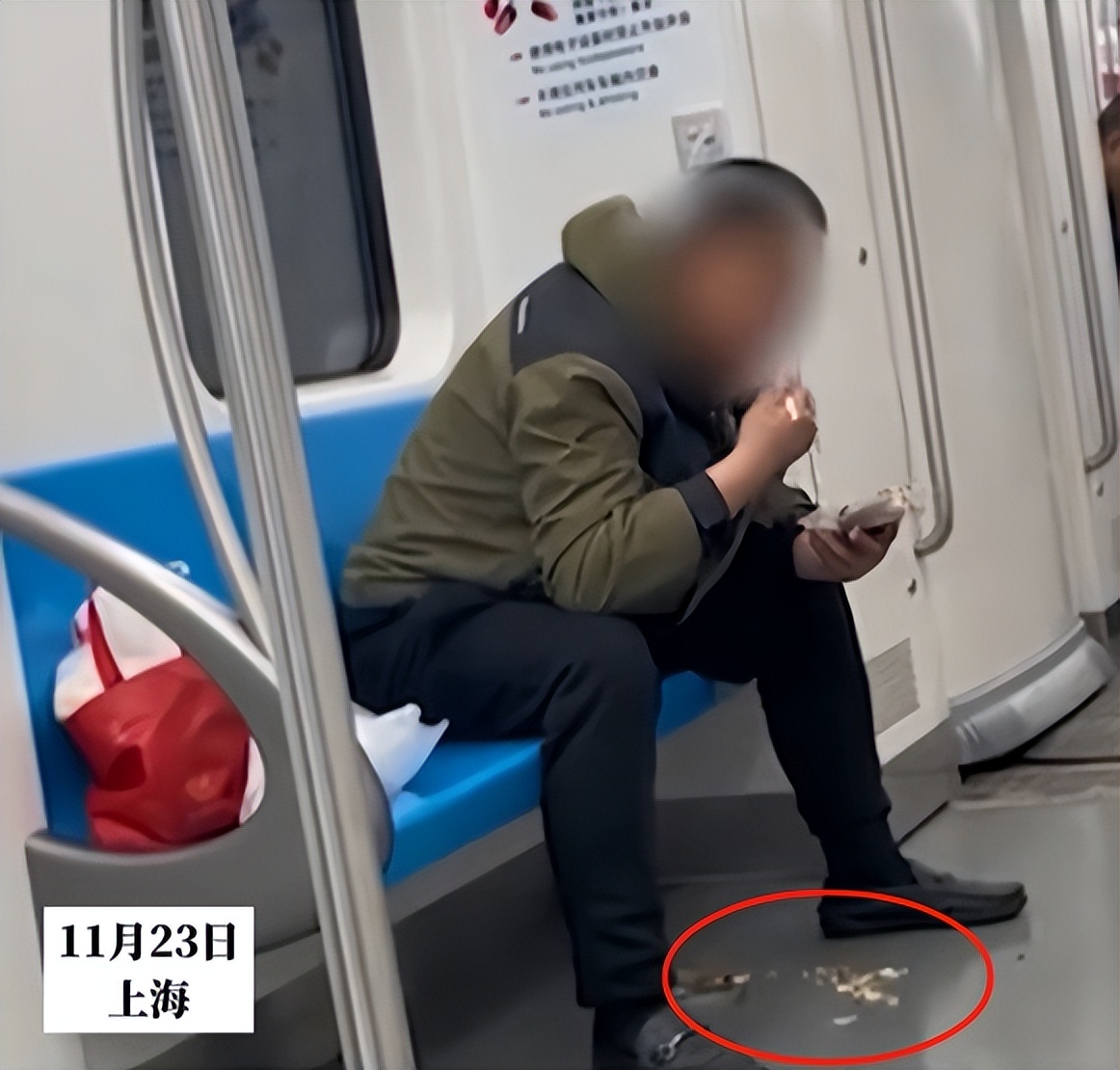 11月23日,上海地铁8号线。一名女子发视频称自己遇到了一个在地铁上吃饭的男子,非常不讲卫生,把地铁地板上吐了很多鱼骨头,然后吃完就走了,也不处理。(信息来源:中原网)
