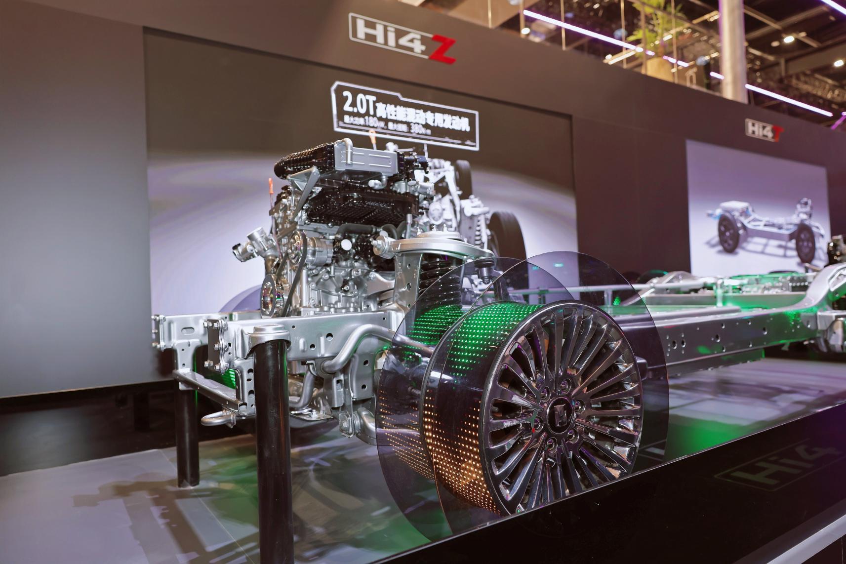 在技术展示区,坦克集中展示了3.0T V6汽油、4.0T V8、柴油混动三大动力总成,以及Hi4-T、Hi4-Z等核心技术平台。