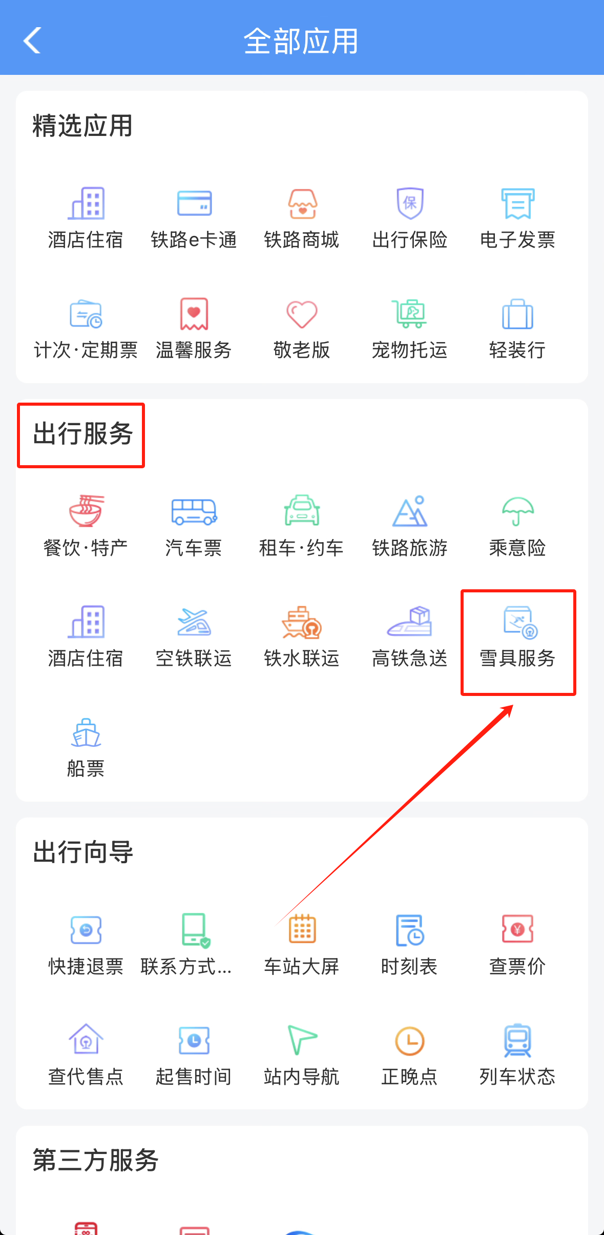 在“出行服务”栏目中,点击“雪具服务”选项。