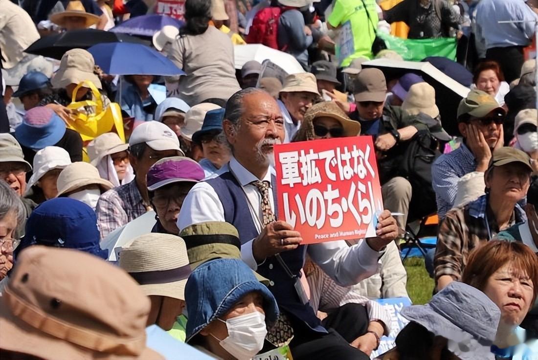 在日本东京,一名集会参与者手举写有“反对军备扩张,要守护生命和生活”的标语