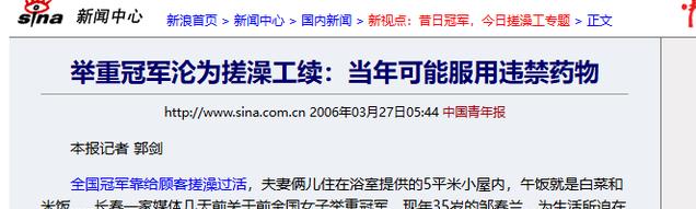 2006年03月27日05:44 中国青年报,举重冠军沦为搓澡工续:当年可能服用违禁药