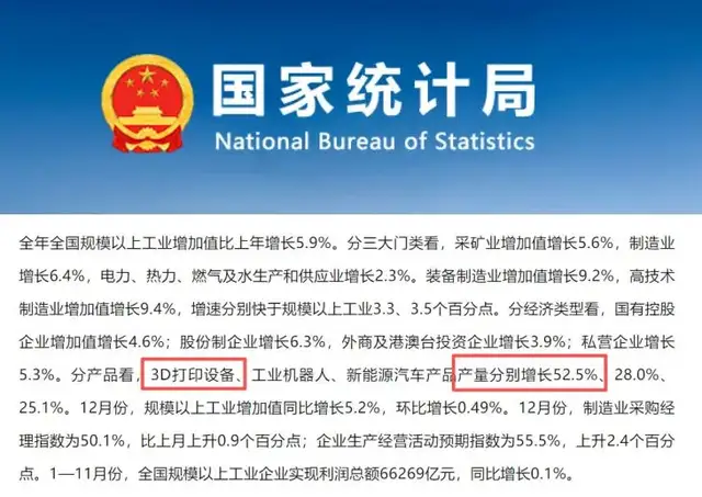 数据佐证了这种体感。国家统计局近日发布的数据显示:2025 年,3D 打印设备产量以 52.5% 的增速领跑中国制造业。
