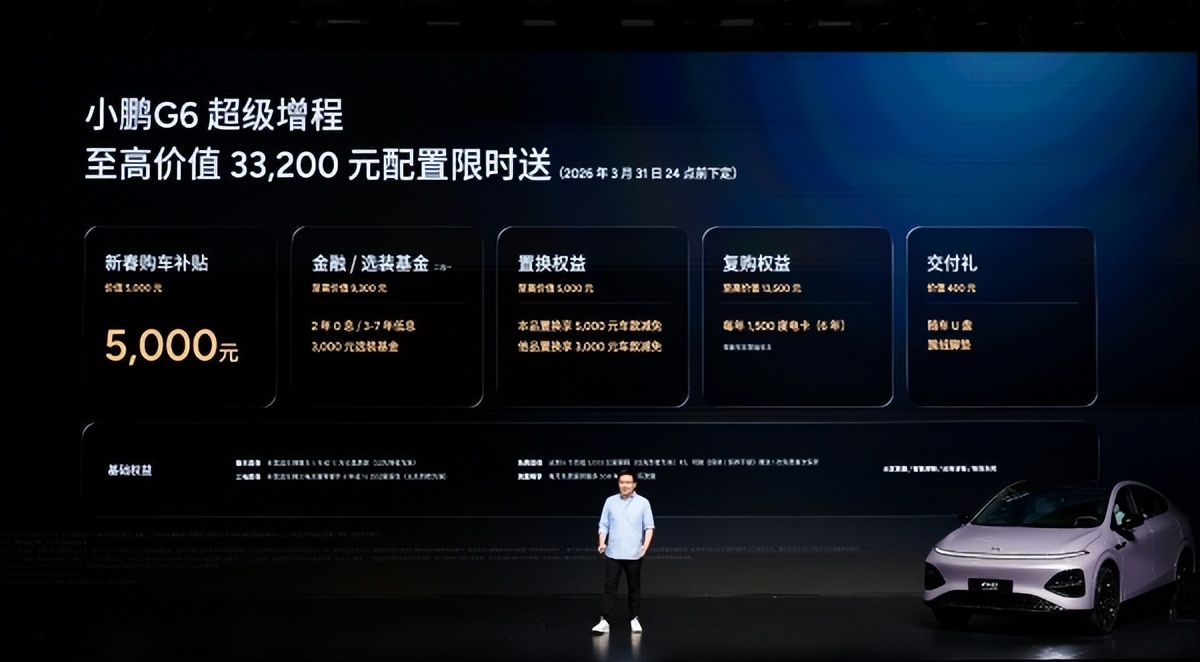 今日,小鹏汽车举行小鹏G6超级增程上市发布会,新车定位六项全能AI增程SUV,以“六项全能 一步到位”为核心,凭借同级综合续航第一、同级补能速度第一、同级车端有效算力第一、同级最强底盘系统、同级最强主动安全和同级得房率第一的六大核心优势,打造真正满足用户全场景需求的国民车。本次发布小鹏G6超级增程1704 Max,官方指导价为18.68万元,用户可选装两个智能升级包,加购12,000元升级为Ultra SE版本、加购20,000元升级为Ultra版本。即日起至2026年3月31日24点前下定小鹏G6超级增程,可享至高价值33,200元限时权益礼包,包括5,000元新春购车补贴、至高价值9,300元金融/选装基金(二选一)、至高价值5,000元置换权益、至高价值13,500元复购权益和价值400元交付礼。