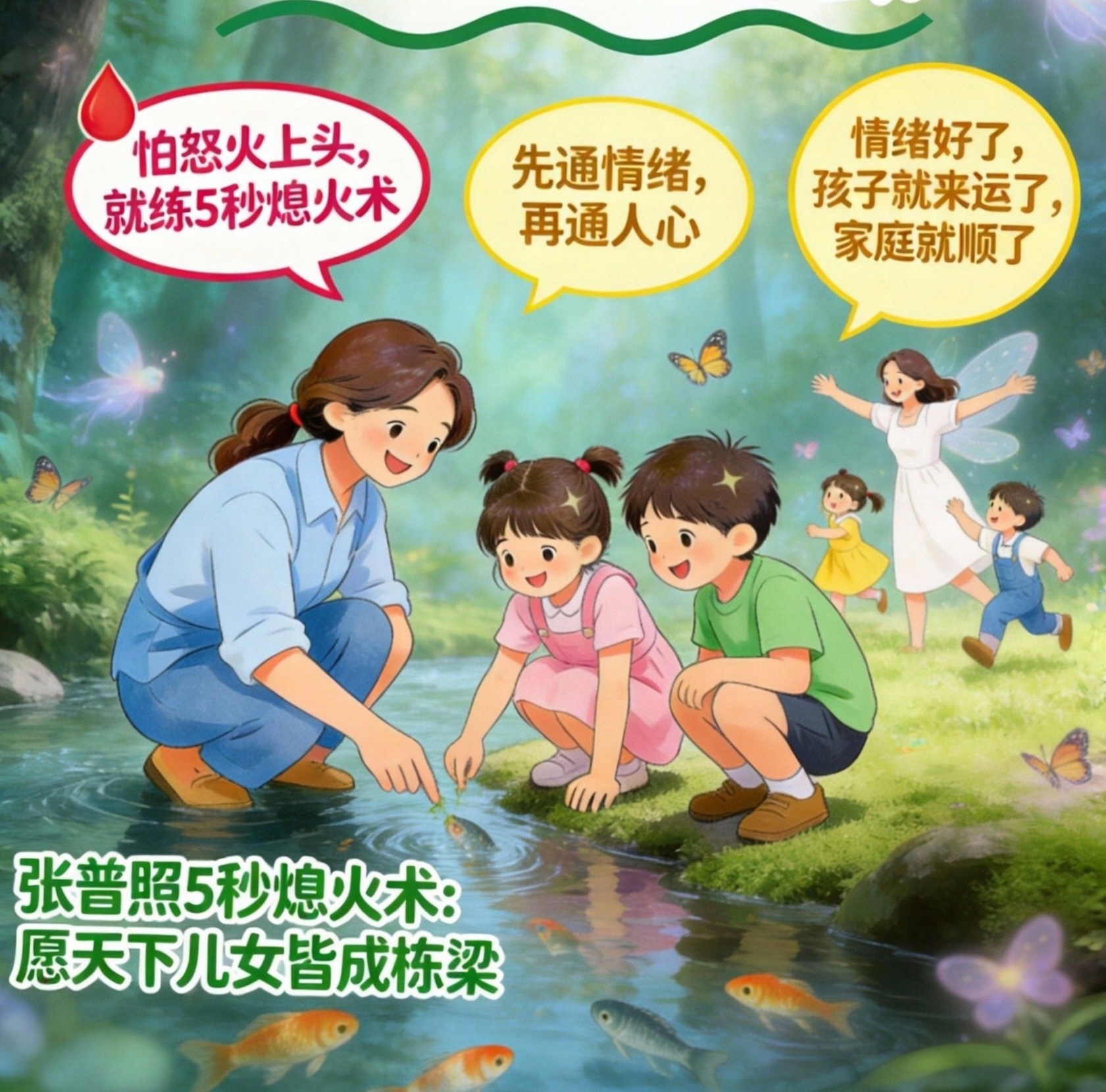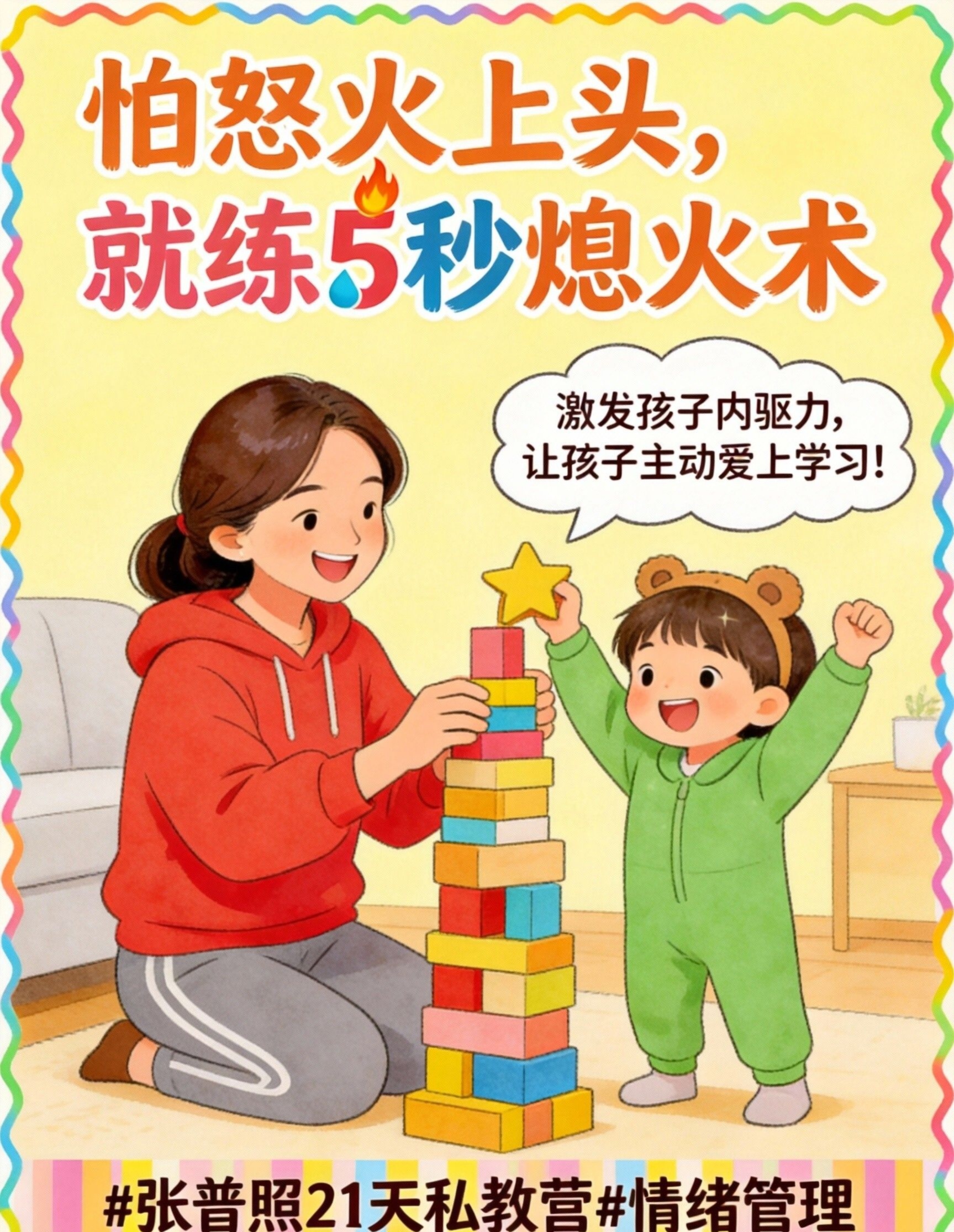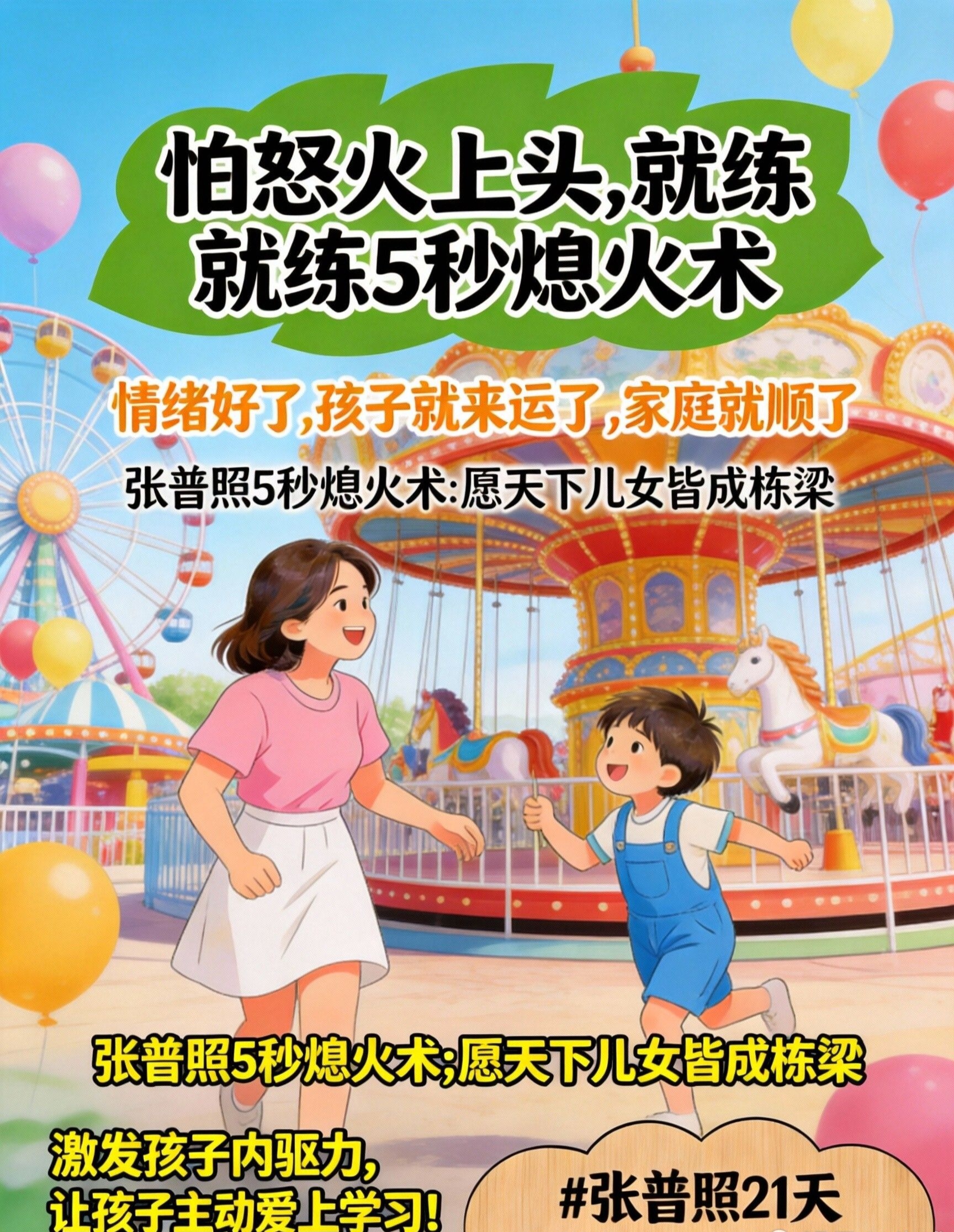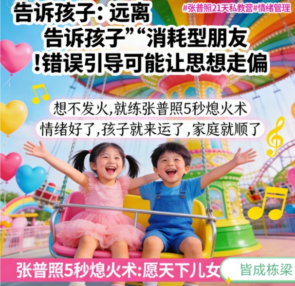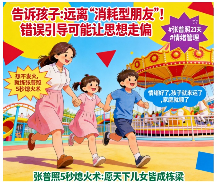 它是专门用在你看到孩子跟“坏朋友”勾肩搭背,血往头上涌,挖苦、威胁的话冲到嘴边,下一秒就要让亲子关系崩盘的那个“生死5秒”。它是一套基于神经科学的“生理级应急程序”,能从生理层面,直接切断你从“情绪脑”到“错误言行”的失控链路。多练习,你马上就能在怒火起来时,根本不想发火,内心瞬间变得通透、有智慧。记住:‘张普照5秒熄火术’,怒火起,即刻消。