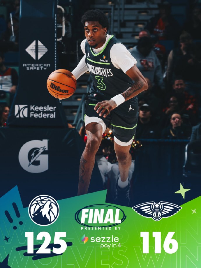在上一场加时险胜鹈鹕之后,森林狼今天又在客场以125-116再次击败鹈鹕,取得4连胜,同时也送给鹈鹕5连败。森林狼战绩来到14胜8负,继续稳居西部第六。而鹈鹕战绩仅3胜20负,稳居西部倒数第一。