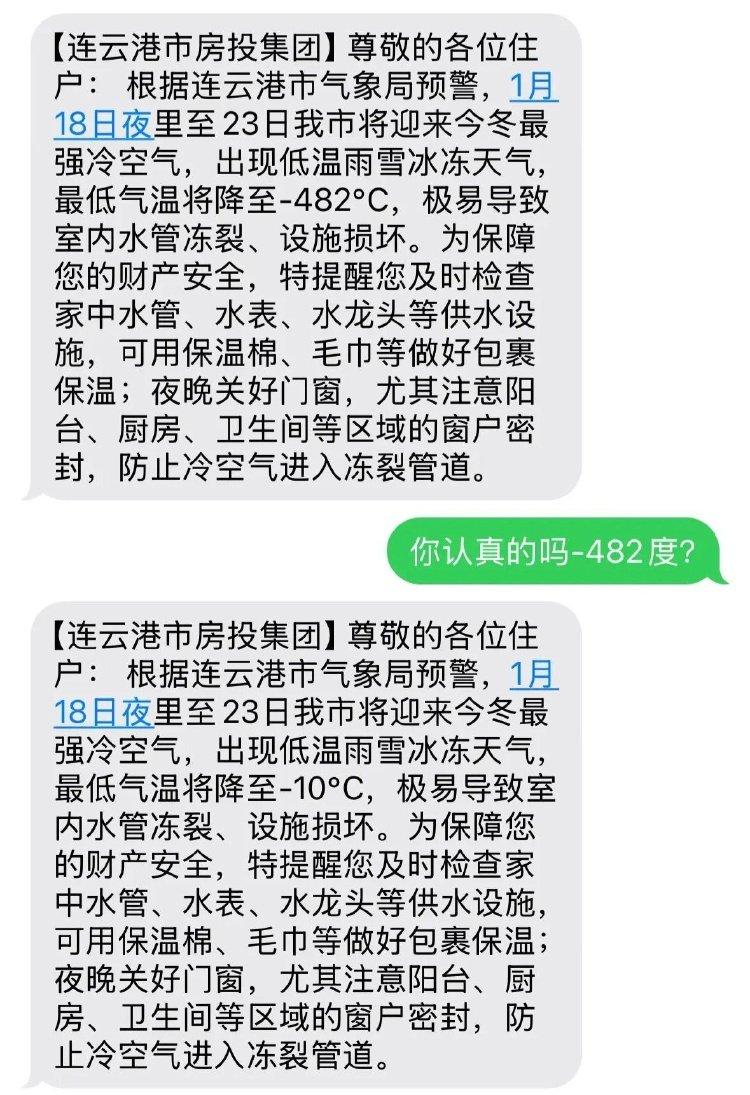 1月16日,多位网友发布的连云港气象预警短信截图,引发关注。短信开头署名“连云港市房投集团”,并写道:尊敬的各位住户,根据连云港市气象局预警,1月18日夜里至23日将迎来今冬最强冷空气,出现低温雨雪冰冻天气,最低气温将降至﹣482℃,极易导致室内水管冻裂、设施损坏。为保障您的财产安全,特提醒您及时检查家中水管、水表、水龙头等供水设施,可用保温棉、毛巾等做好包裹保温;夜晚关好门窗,尤其注意阳台、厨房、卫生间等区域的窗户密封,防止冷空气进入冻裂管道。