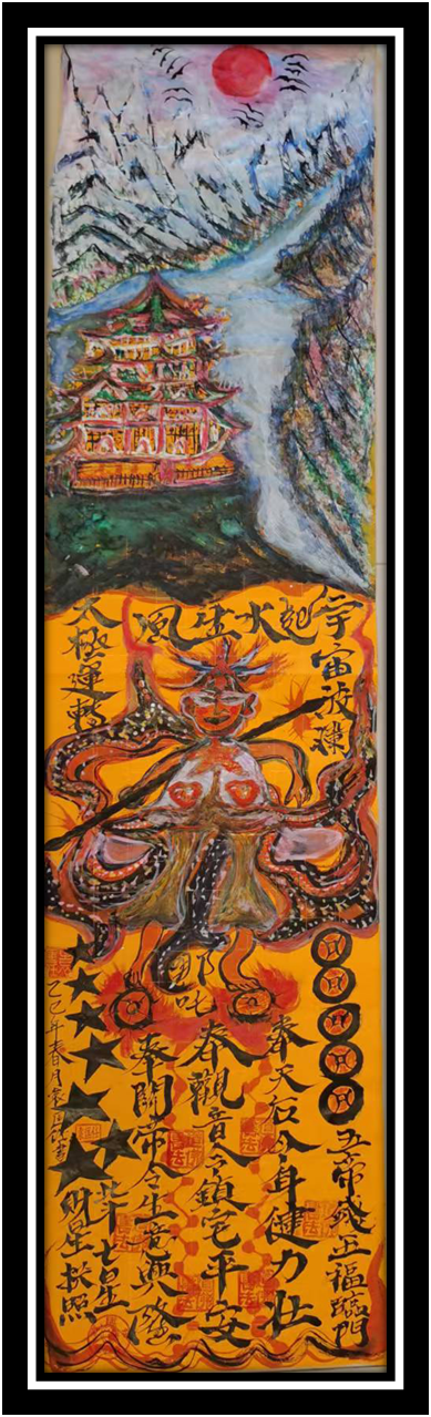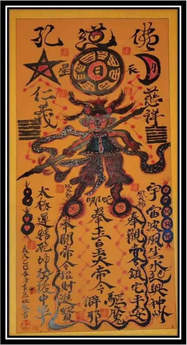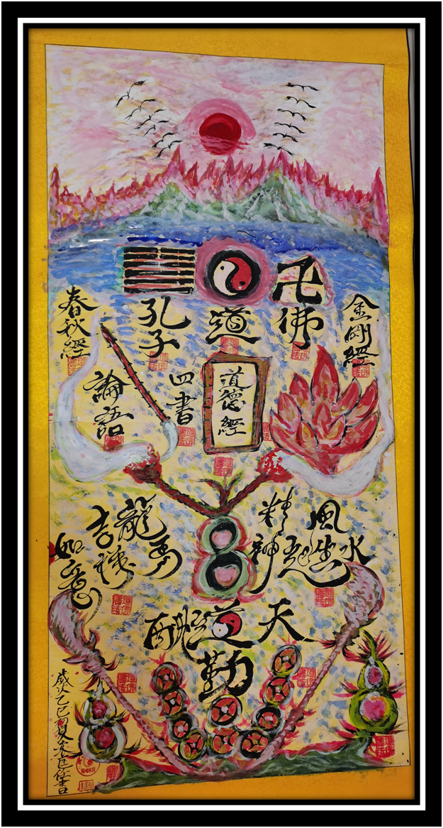 主要元素:日月星辰,冰峰,山河,海洋,旭日,紫气,神鹰,孔道佛,仁爱,慈祥,功德,长寿,养生,养心,关刀,拂尘,葫芦,金钱,金刚经,道德经,春秋经,周易,四书,五经,心经,关帝,观音,吕祖,道祖,佛祖,太极,乾坤,宇宙,北斗,八卦。莲花,莲藕,莲子,道笔,龙凤,镇宅,平安,驱魔僻邪,招财,进宝,生意兴隆,身体健康,财源滚滚,有求必应,天后,黄大仙,天道酬勤,海纳百川,神州,中华。卍,天地,老子,孔子,太上老君,道法自然,佛心,道心。
