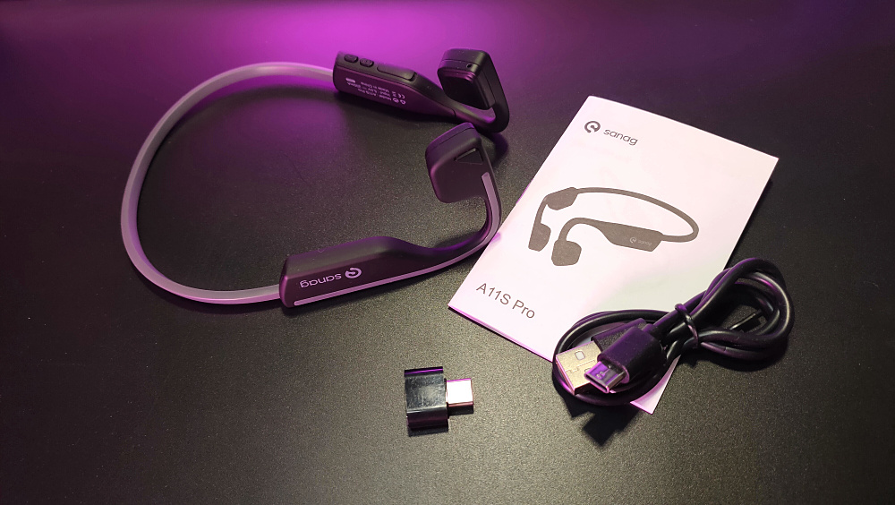 盒子内包含sanag气传导耳机A11S 、Type-C充电线、转接头以及使用指南,因为声音传导方式的不同所以并未有像骨传导耳机那样给配备隔音耳塞。