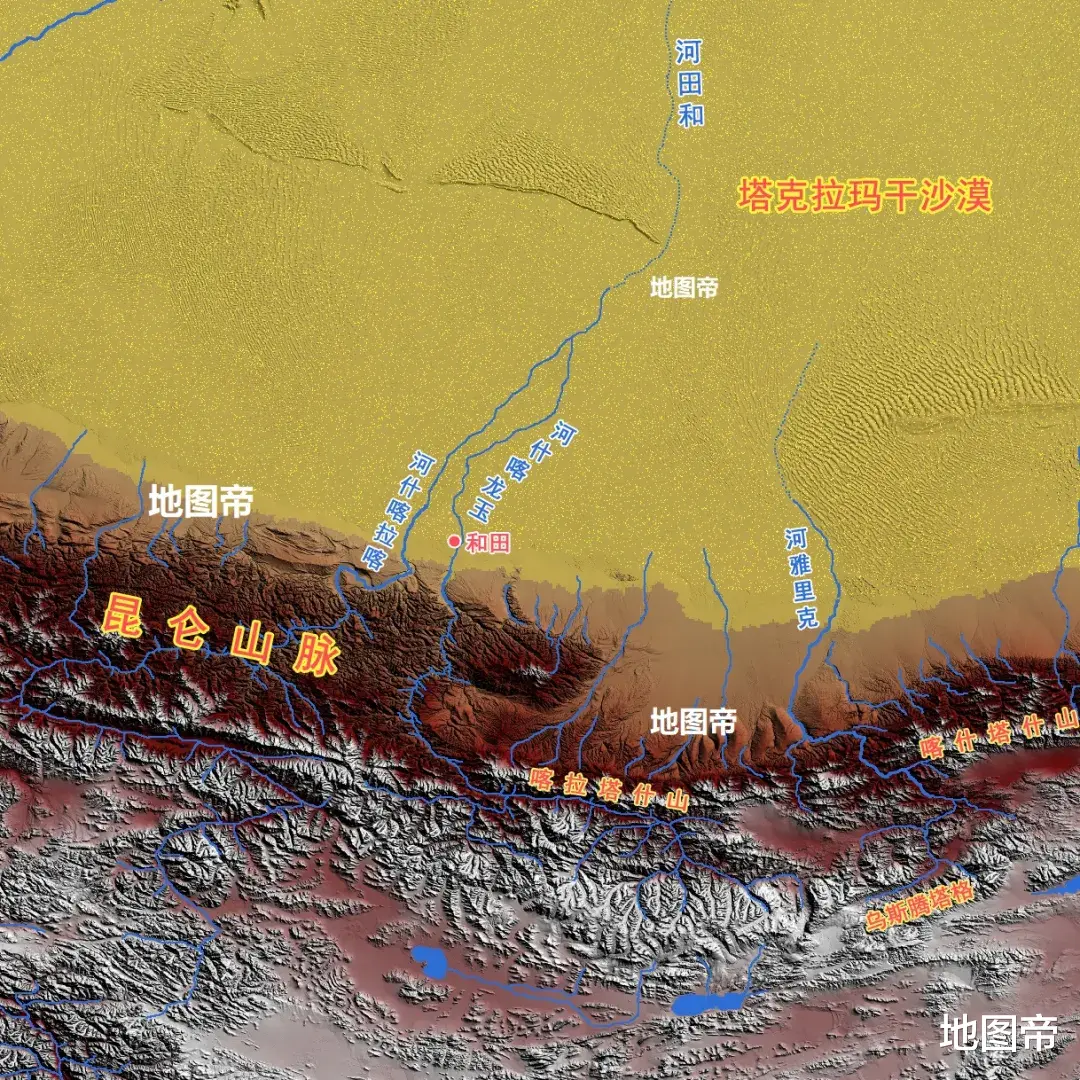 和田地区位于新疆最南端,南枕昆仑山脉,北部深入塔克拉玛干沙漠腹地,面积24.74万平方千米。和田地势南高北低,南部雄伟的昆仑山成弧形横贯东西,中部为峡谷遍布的山前坡麓地带,北部为塔克拉玛干沙漠,由南部山地7167米下降到北部1050米。