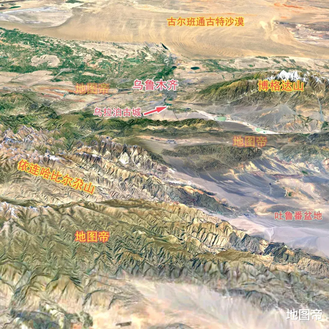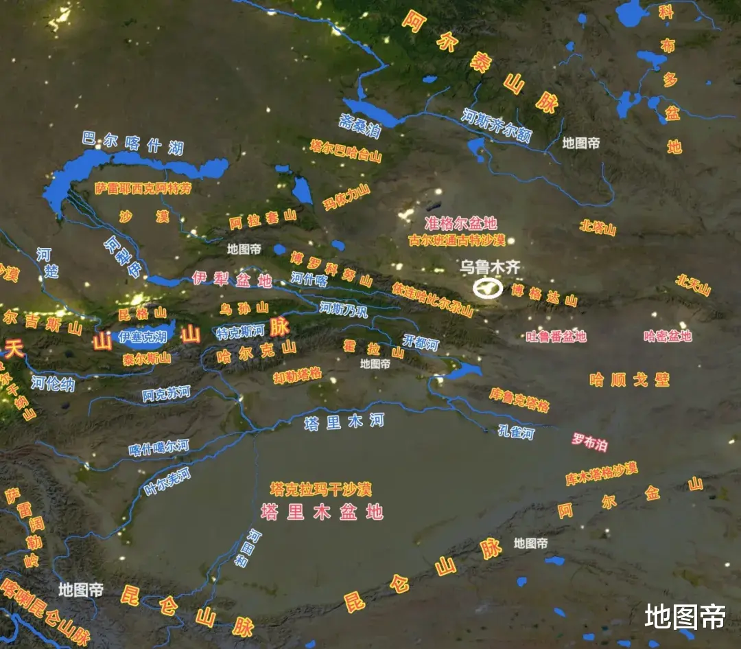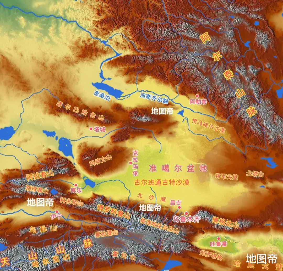 准噶尔盆地中间几乎都是沙漠,城市大多分布在边缘,其中南缘有乌鲁木齐、石河子,西缘有克拉玛依等。