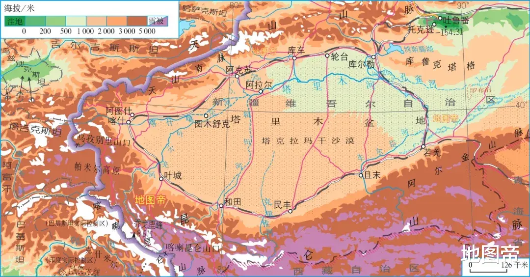 塔里木盆地大部分地区是沙漠,城市大多分布在边缘,其中南缘有和田,西缘有喀什,北缘有阿克苏、库尔勒等。